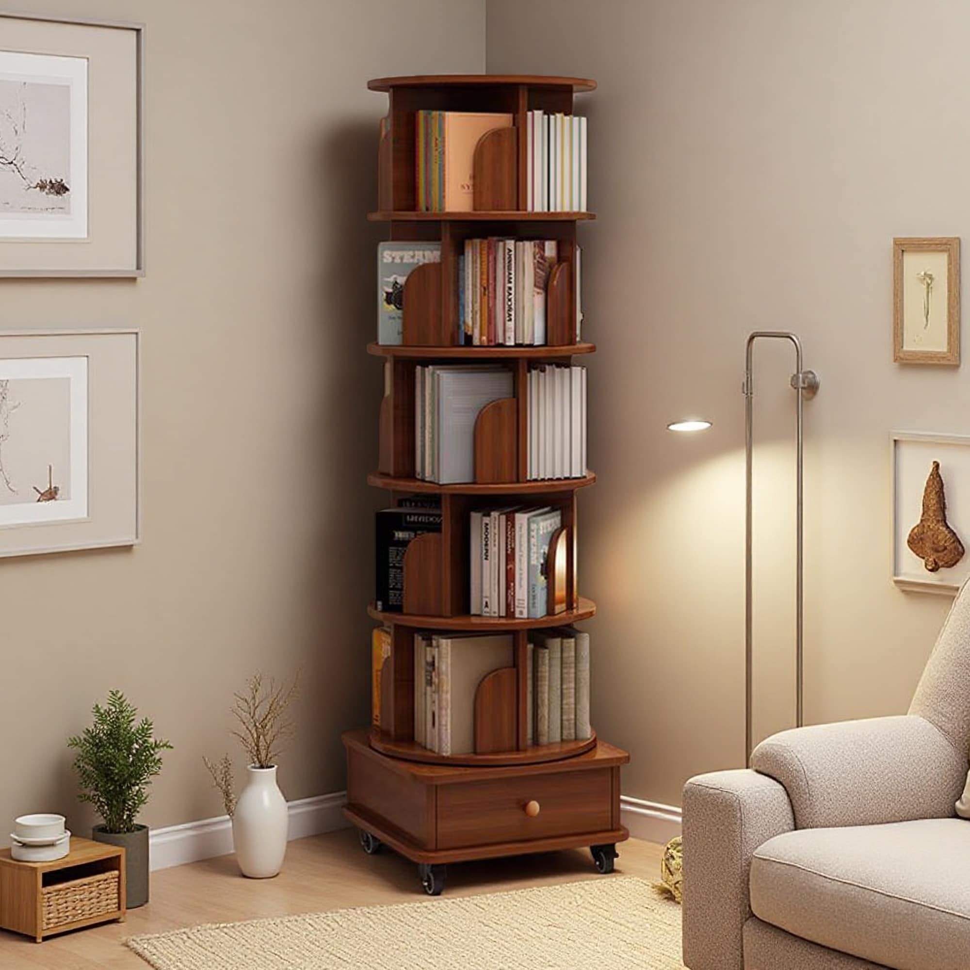 69"H 6-Tier Wooden Rotating Bookshelf, 360° Corner Display, Narrow Floor Organizer