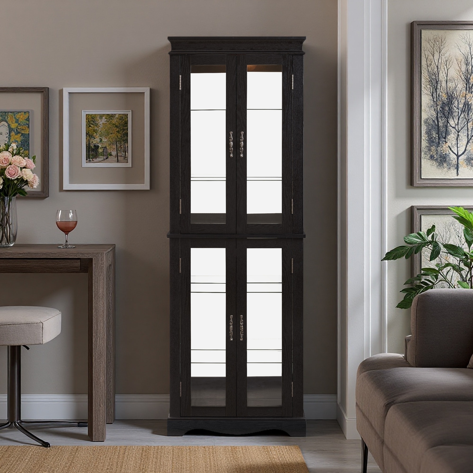 Lighted Glass Curio Display Cabinet with Adjustable Shelves, Drawer and Glass Doors