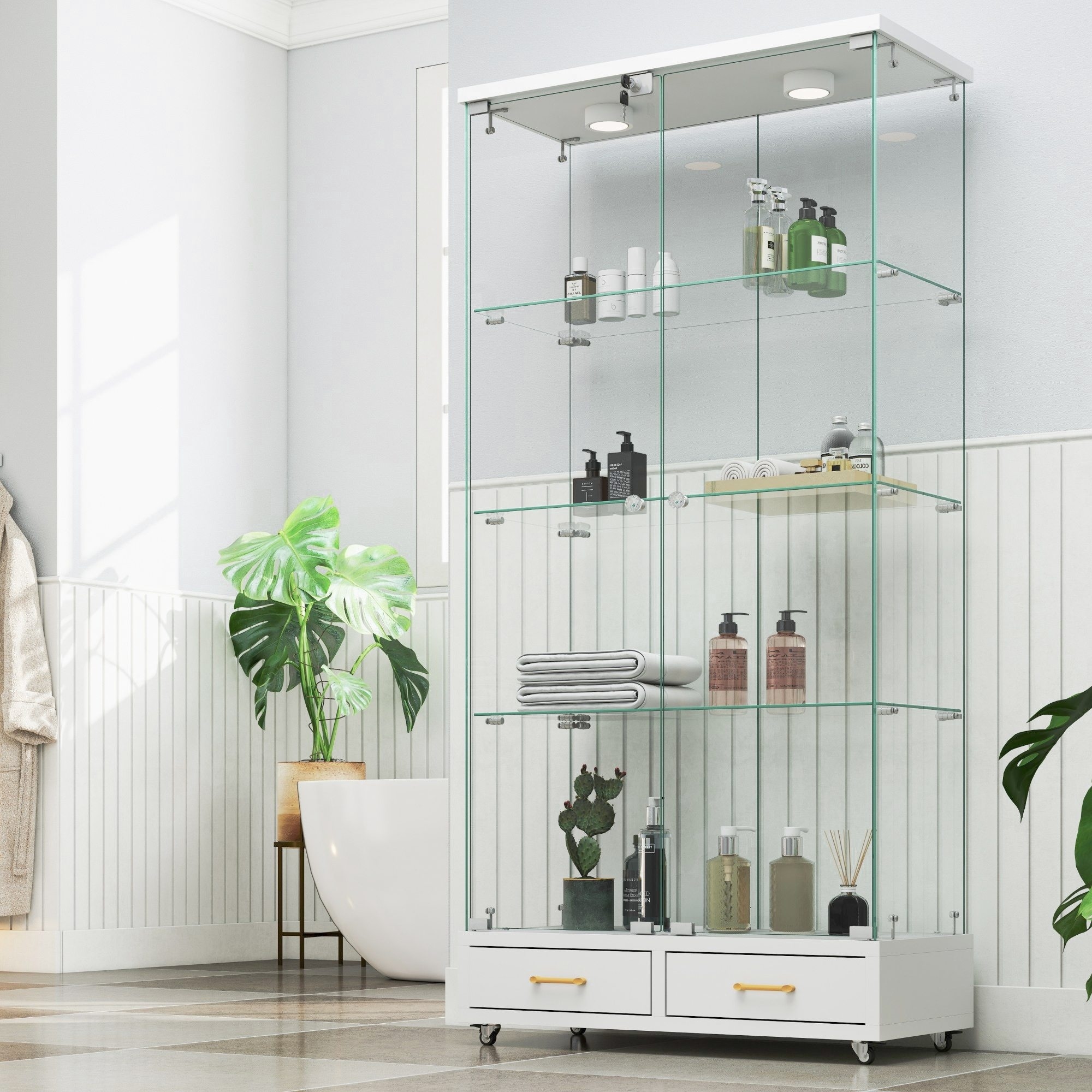 Modern Glass Display Cabinet with LED Lights and 2 Drawers