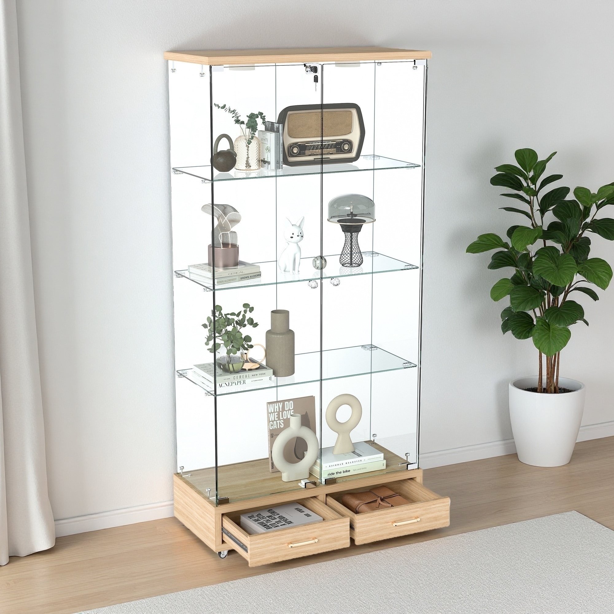 65.8"H Glass Display Cabinet with LED Lights, 2-Door Tempered Glass Storage Case, 4 Shelves & Large Drawers, for Living Room