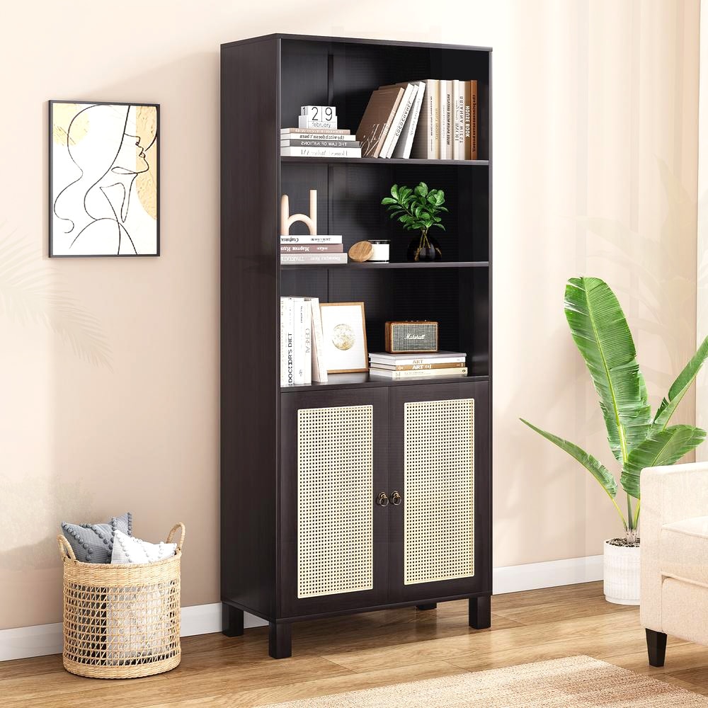 5 Tier Tall Bookcase with Rattan Doors Wood Shelves for Home Office