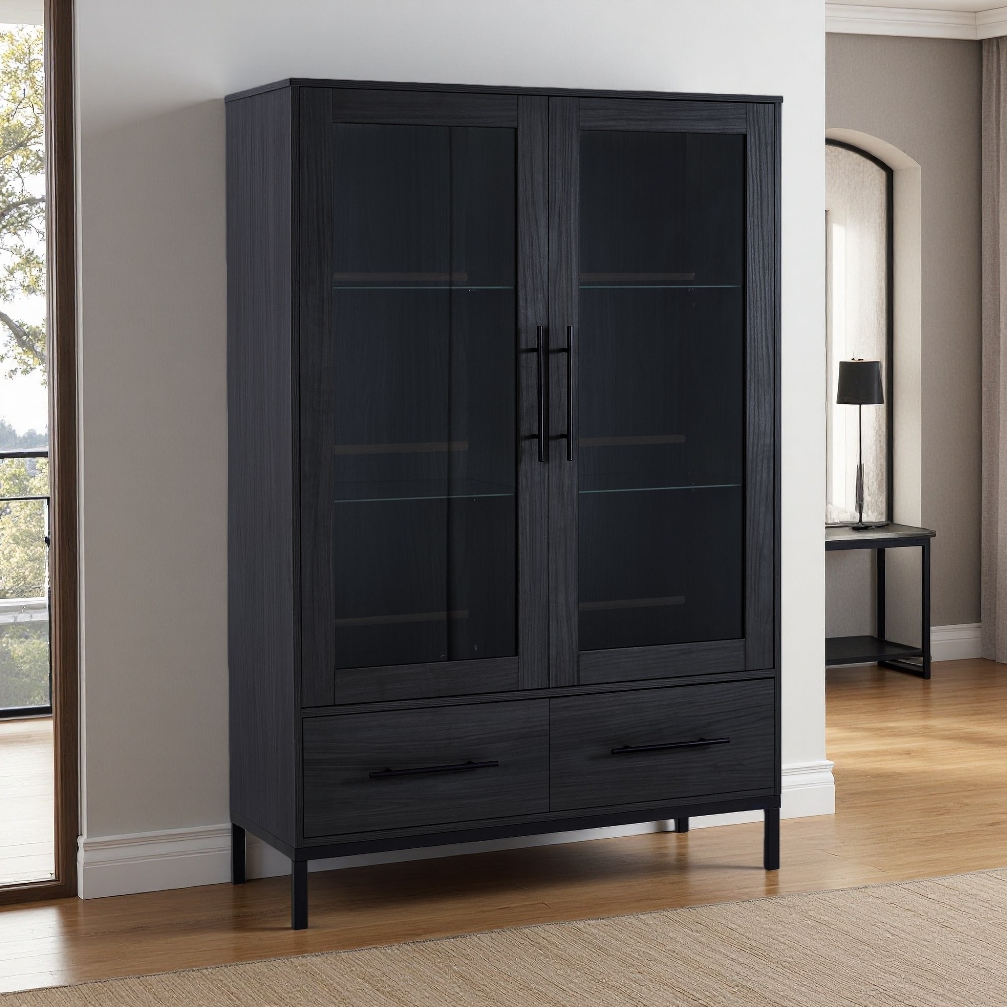 60"H Display Cabinet with 2 Storage Drawers, Pantry with Glass Doors & LED Lighting, Cabinet with 4 Adjustable Glass Shelves