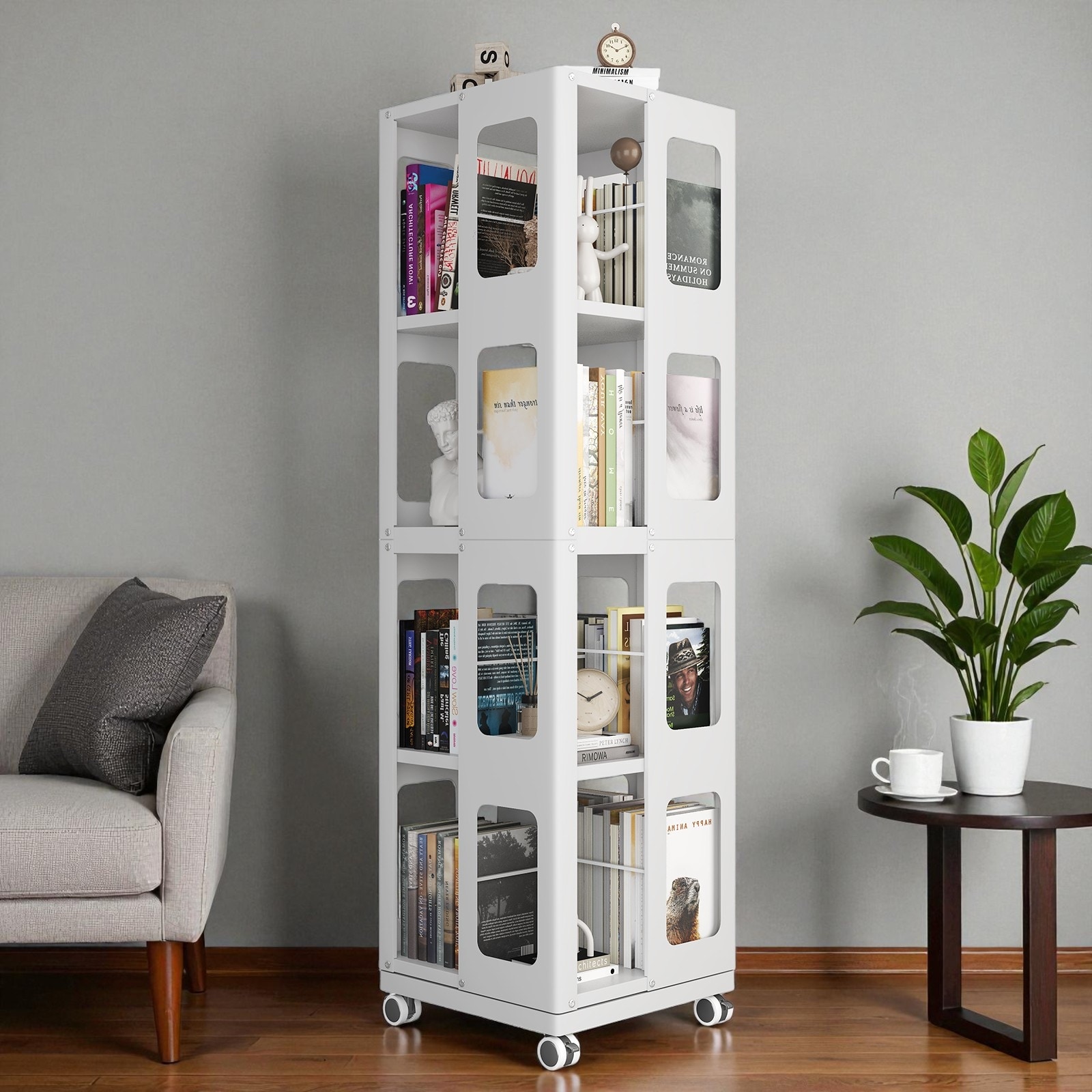 4-Tier All-Steel Rotating Bookshelf with 360° Wheels, Large Sturdy Metal Book Rack, Space-Saving Freestanding Storage Organizer