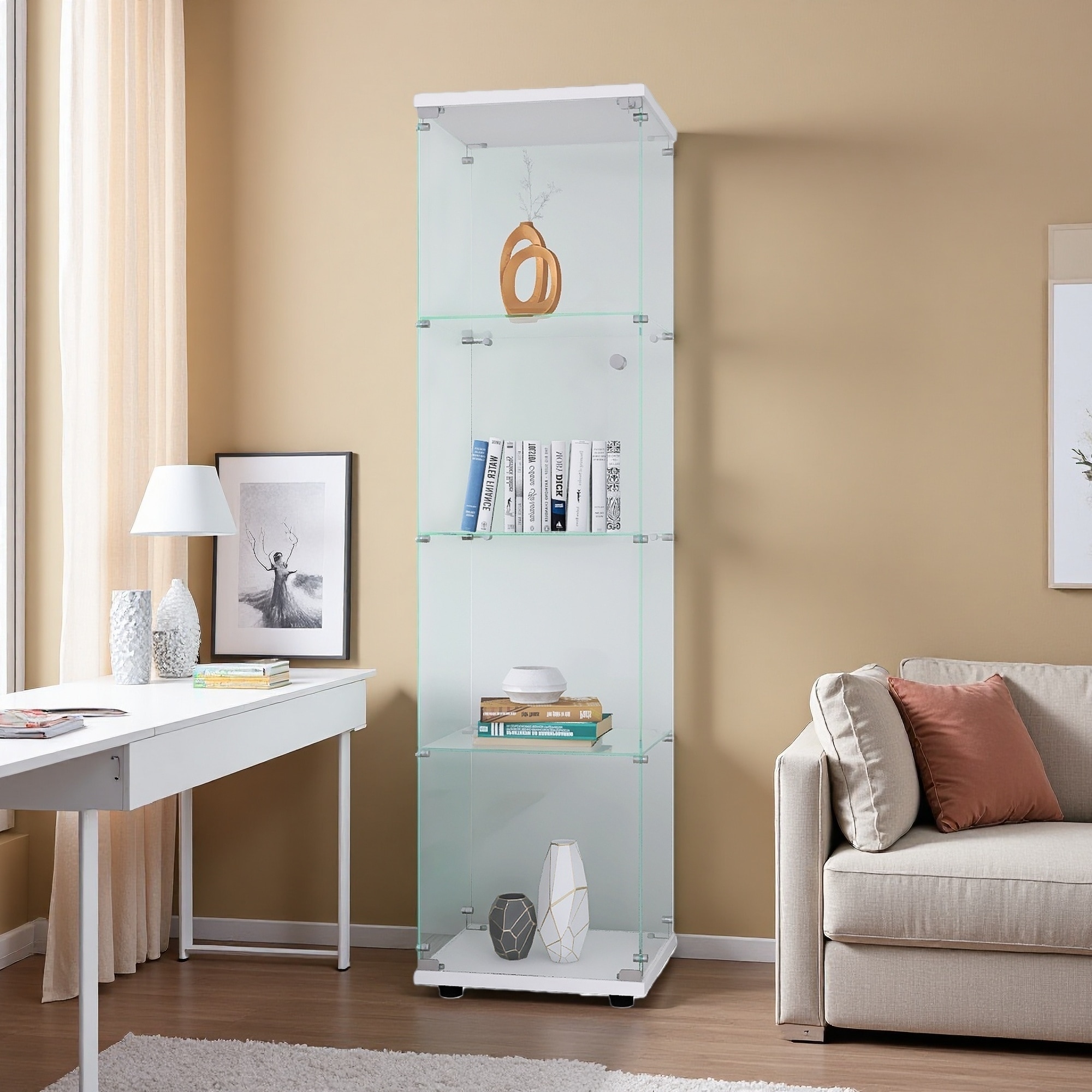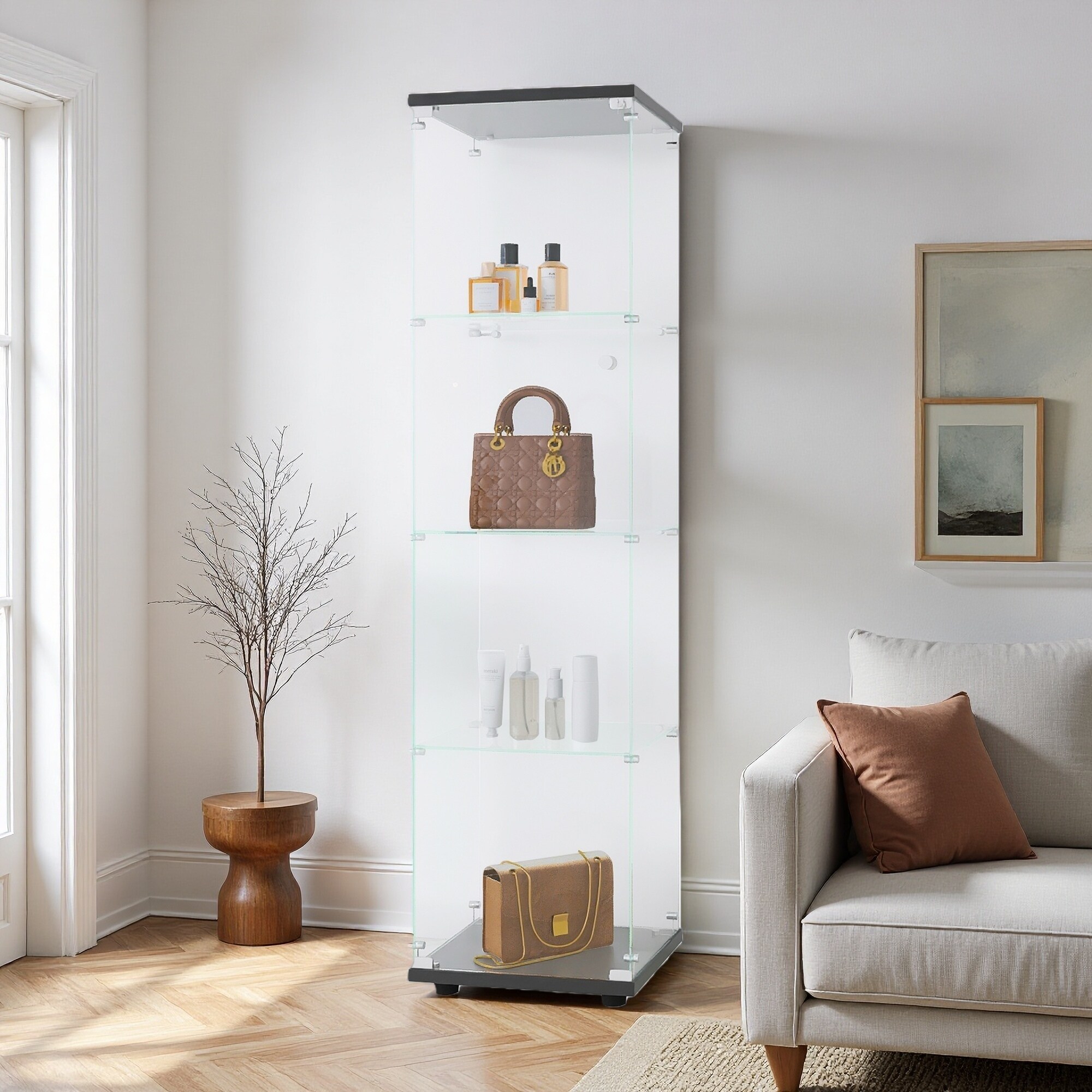 64.7"H Glass Display Cabinet, 4 Shelves, One Door, Tempered Glass & Wood