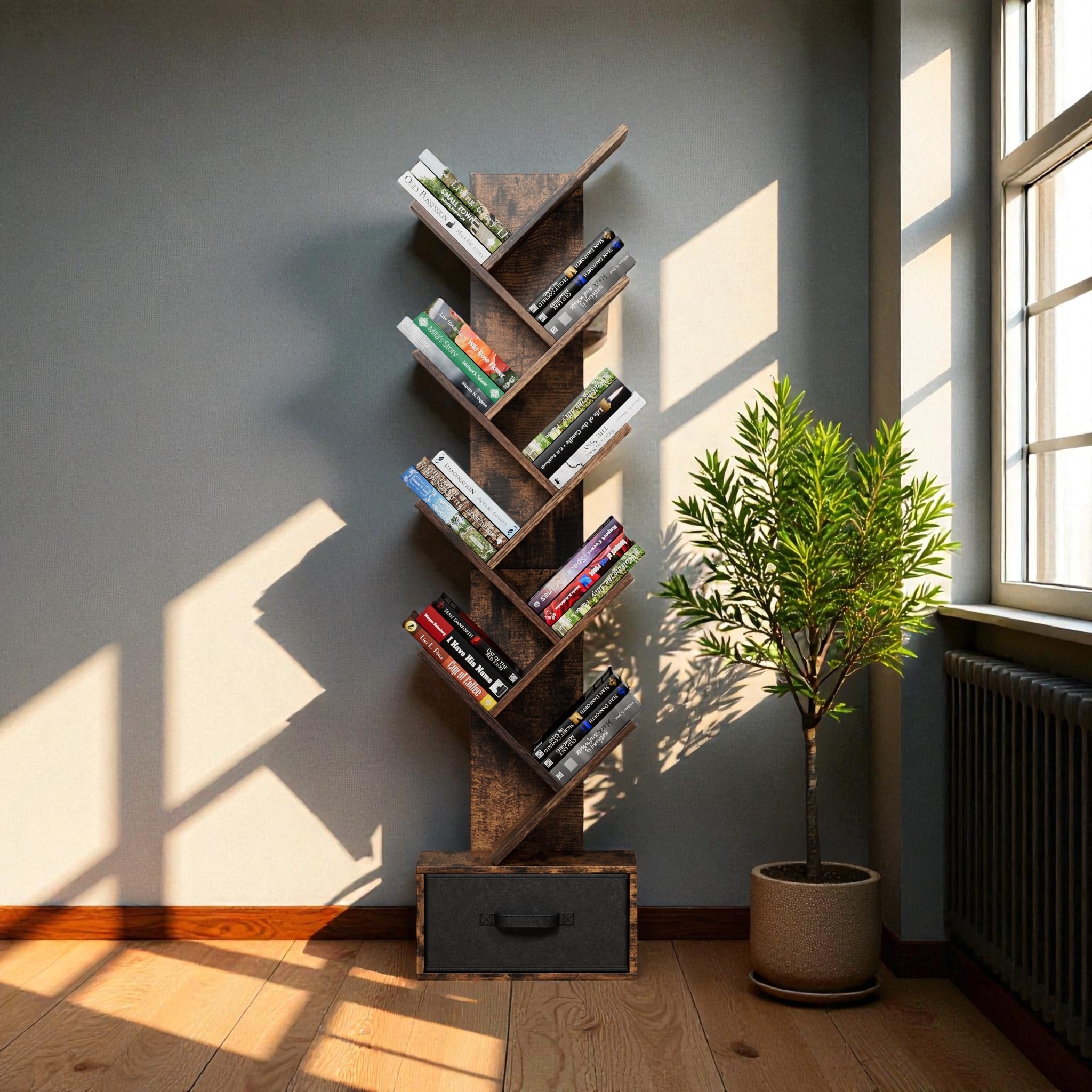 9-Tier Tree Bookshelf with Drawer, Freestanding Vertical Bookcase, Modern Space-Saving Organizer for Living Room or Home Office