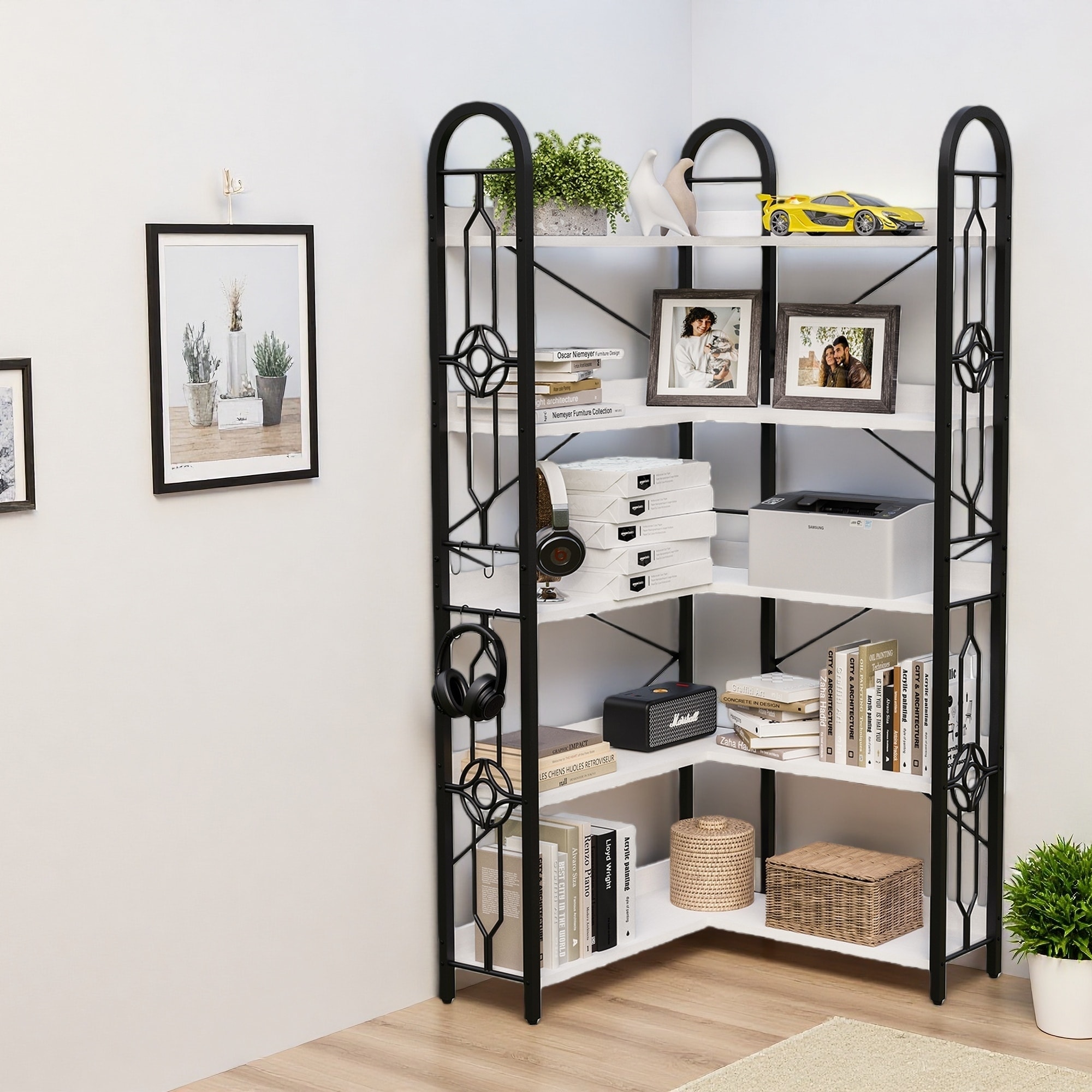 72.05"H 5-Tier Corner Bookshelf, Open Shelf, Painted Steel Frame, Bedroom & Living
