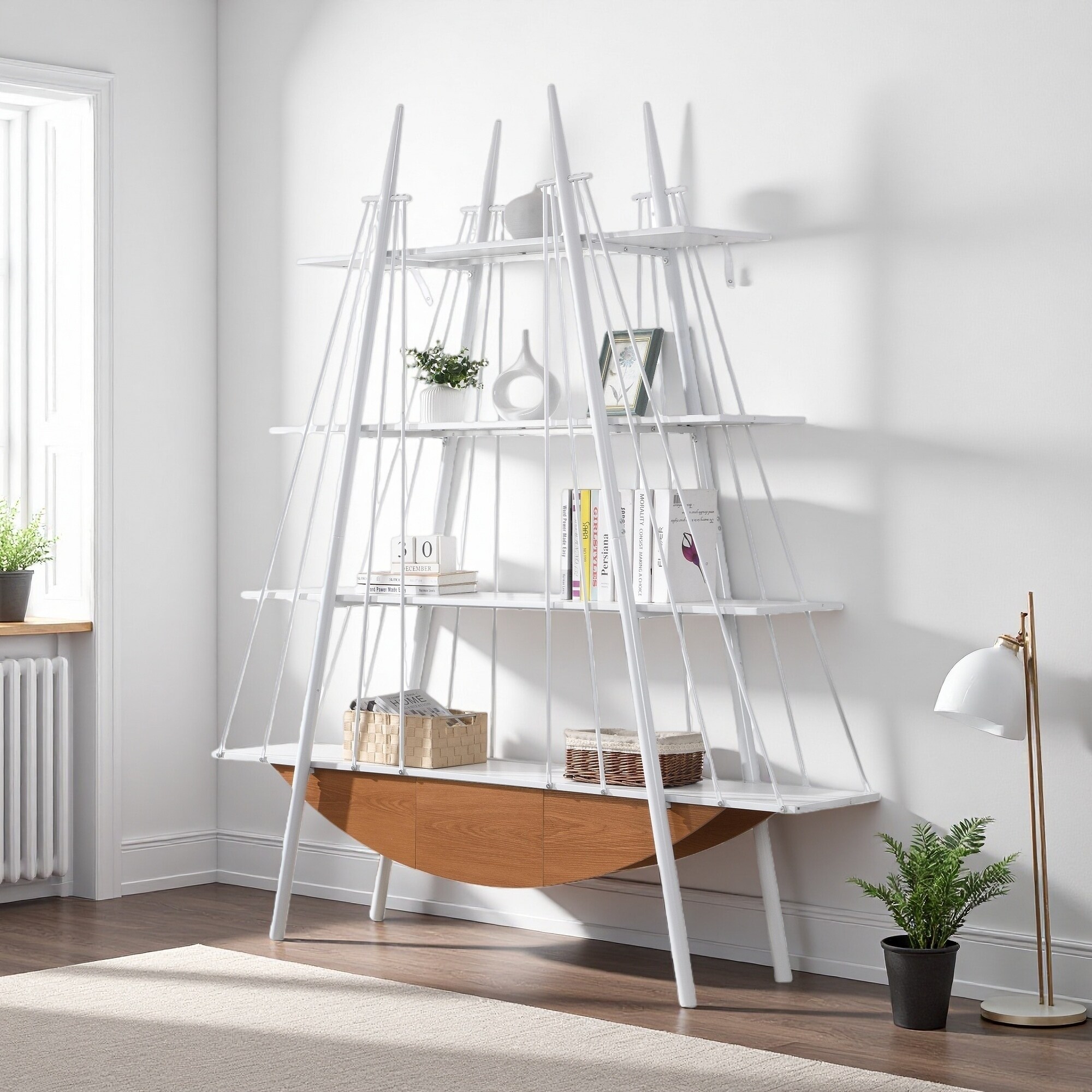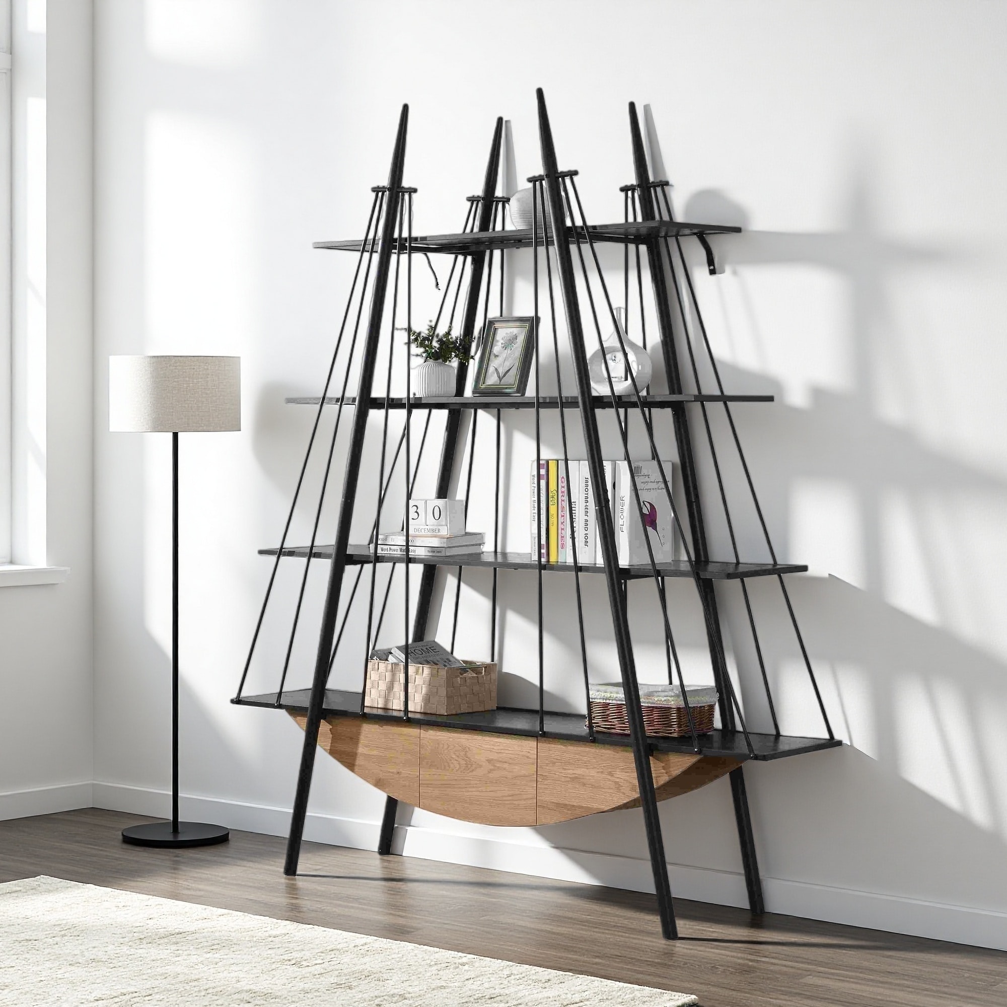 84.65"H Sailboat-Inspired Industrial Wooden & Metal 4-Tier Bookcase with Drawer, Sturdy Display Shelf for Living Room & Office