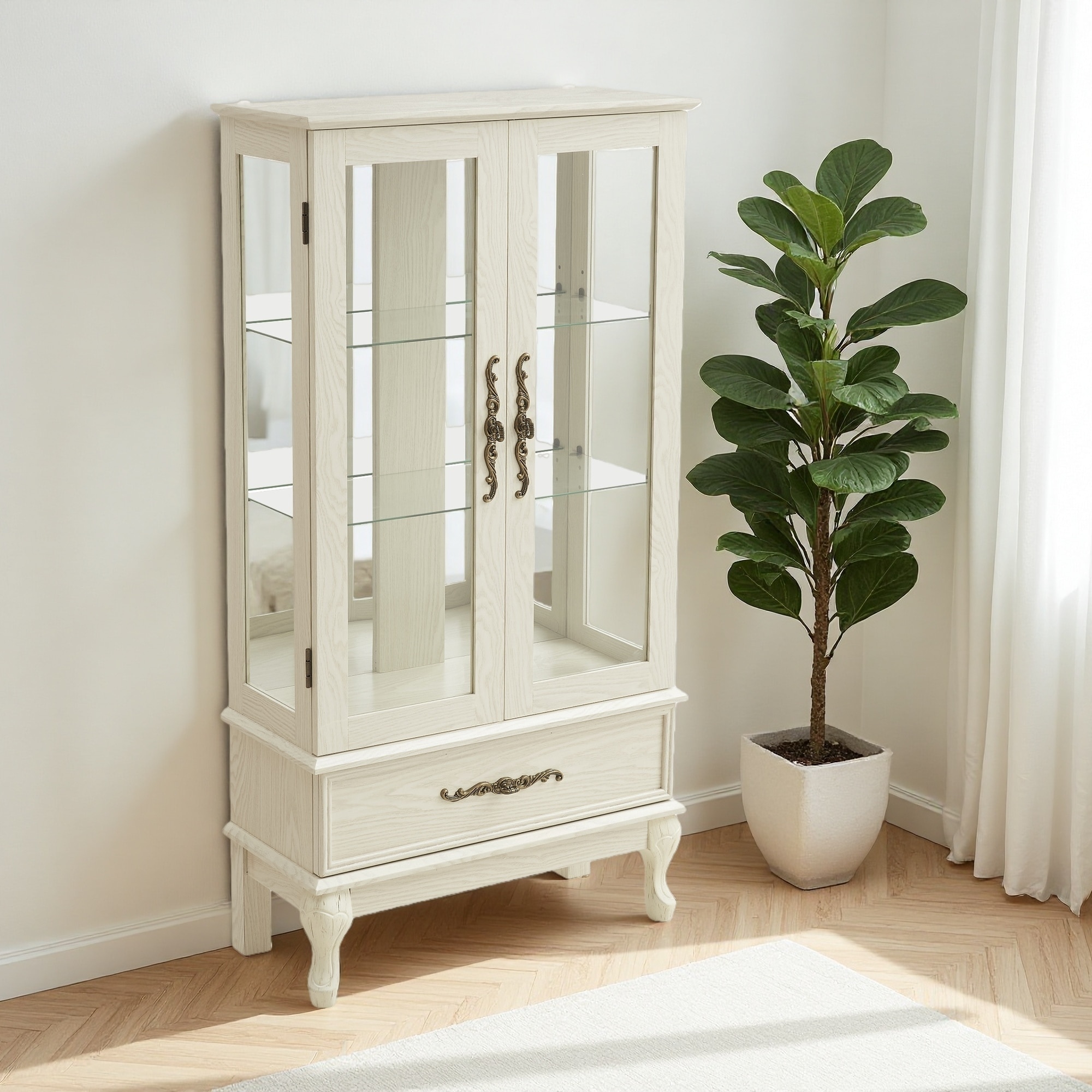 51.58"H Curio Cabinet Lighted Glass Cabinet with Adjustable Shelves, 2 Doors, 1 Drawer Sideboard, Bulb Included