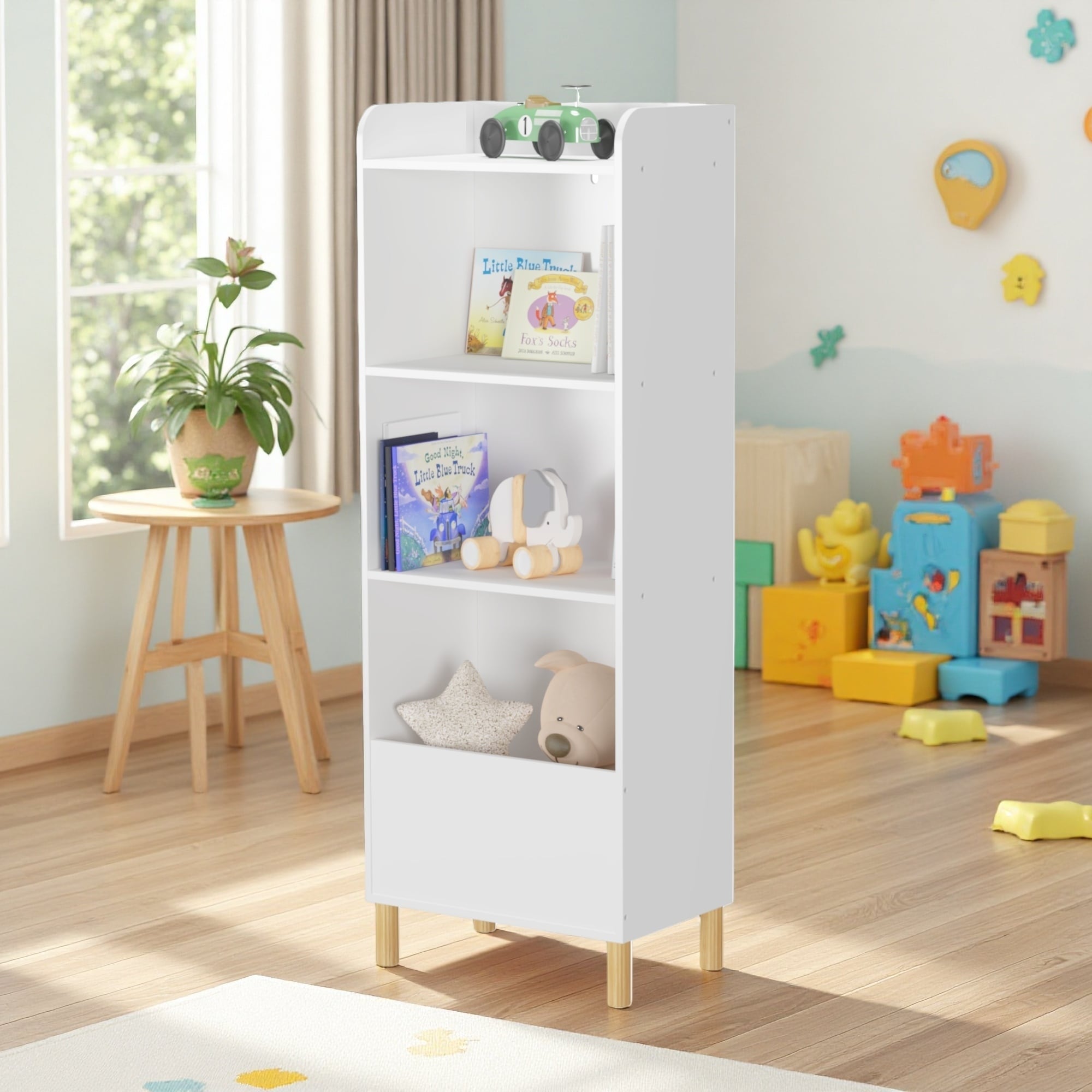 51"H Kids 4-Tier Bookcase, MDF & Pine Legs, Toy & Book Storage with Safety Buckle