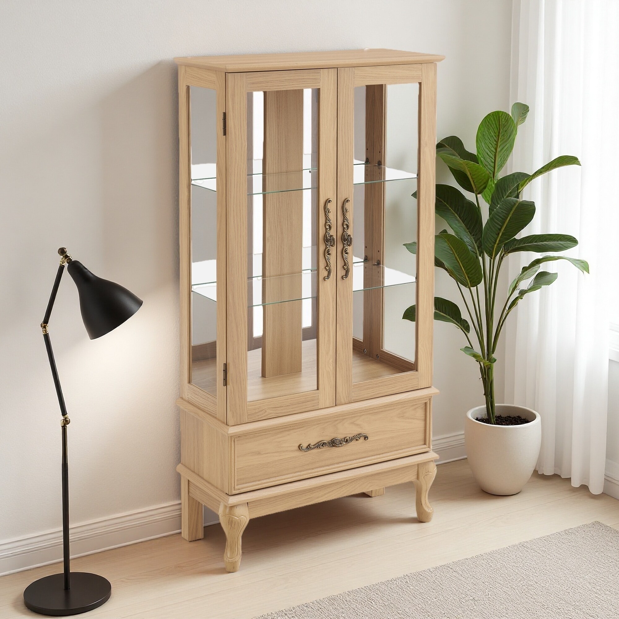 51.58"H Curio Cabinet Lighted Glass Cabinet with Adjustable Shelves, 2 Doors, 1 Drawer Sideboard, Bulb Included