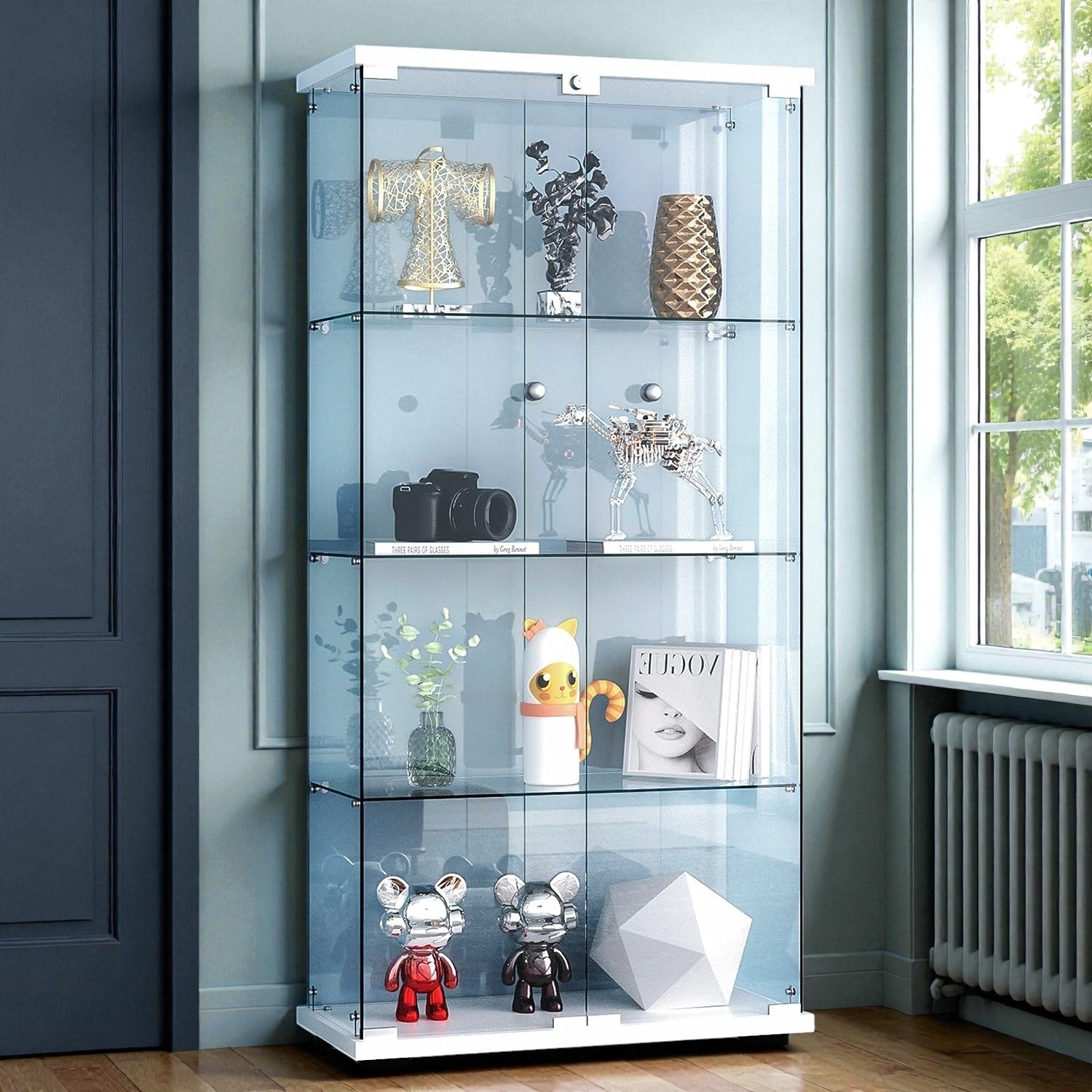 65" Glass Display Cabinet with 4 Shelves & 2 Doors, Lockable Floor-Standing Glass Bookshelf with RGB LED Push Lights, White.