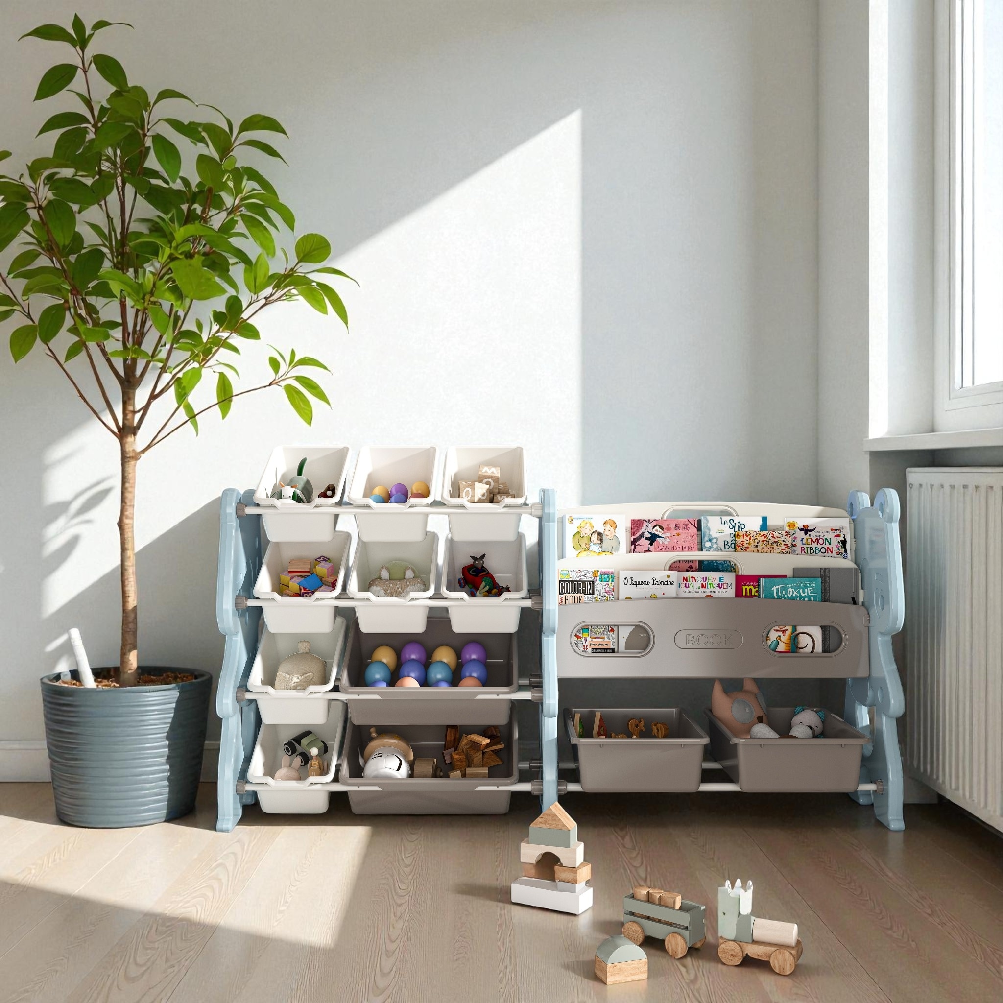 Kids Toy Storage Organizer with 12 Bins and 2-Tier Bookshelf, Multi-Functional Toy Shelf for Playroom, Bedroom, or Classroom