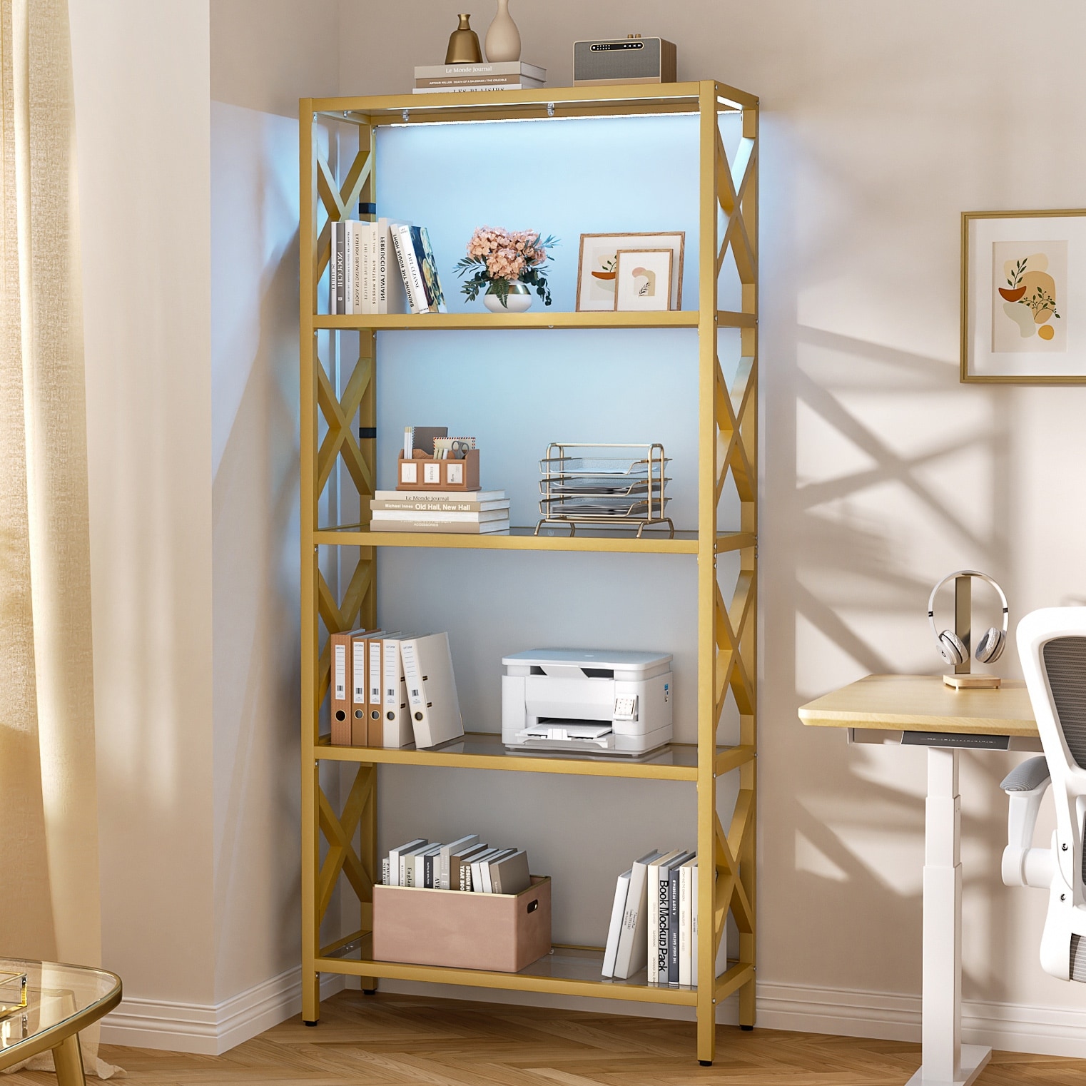 Modern Gold Bookshelf with Tempered Glass Shelves, 3-5 Tiers Display Storage Shelving