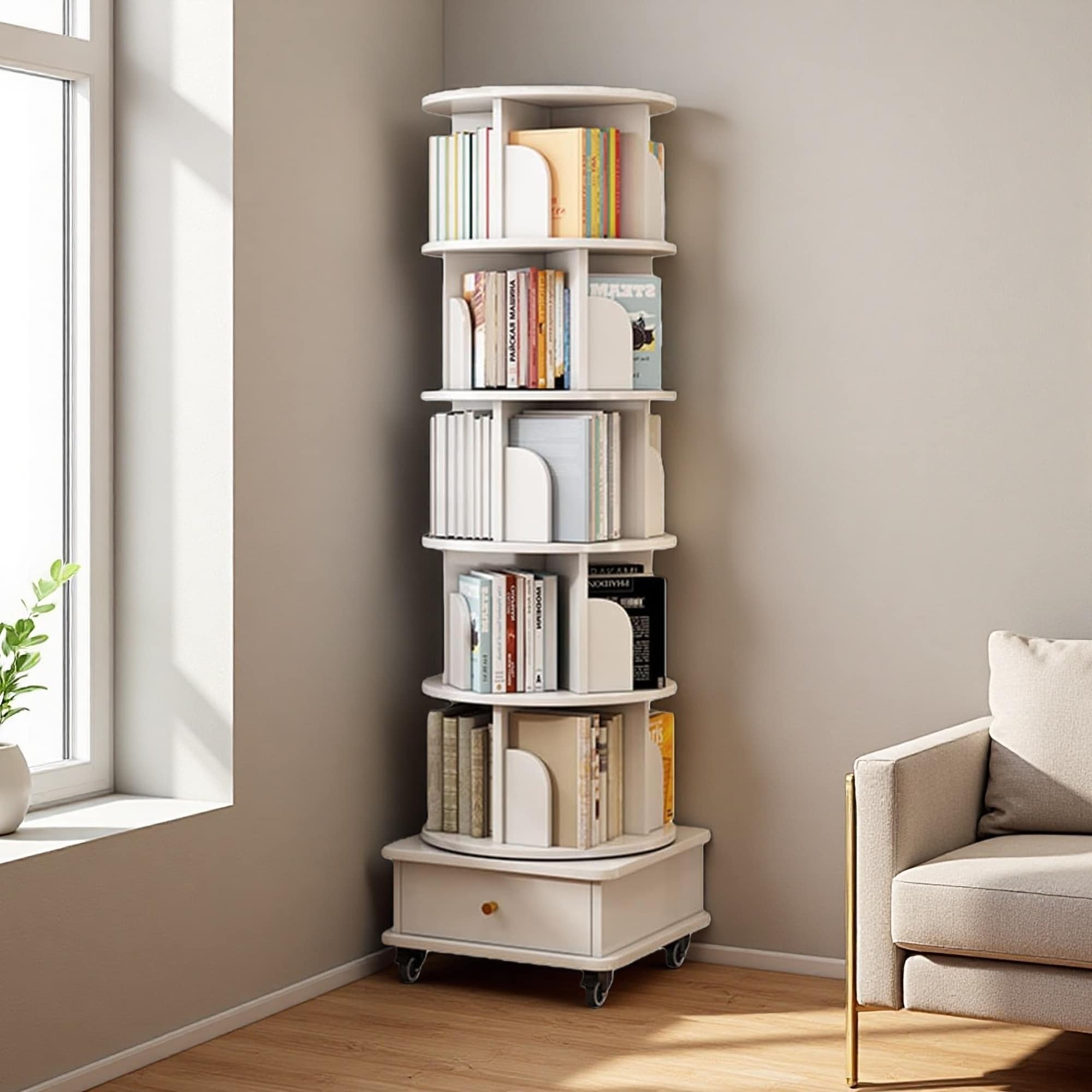 68"H 6-Tier Rotating Bookshelf, 360° Round, Wheels & Drawer, Living Room Storage