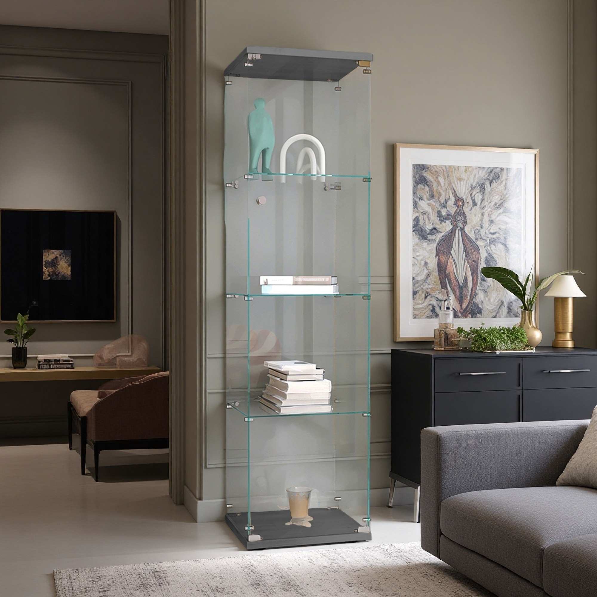 64.56"H Glass Display Cabinet, 1 Door, 4 Shelves, Tempered Glass, Adjustable Feet