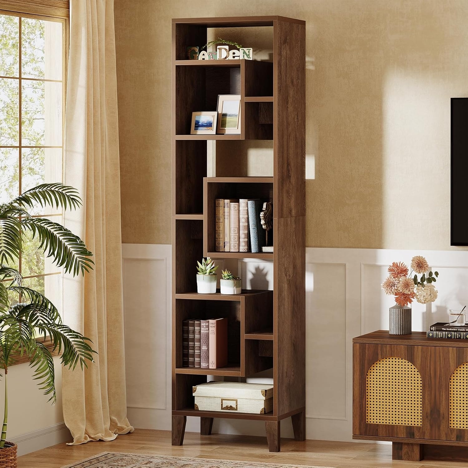 71" Tall Narrow Bookcase with Open Storage, 8-Tier Staggered Skinny Bookshelf
