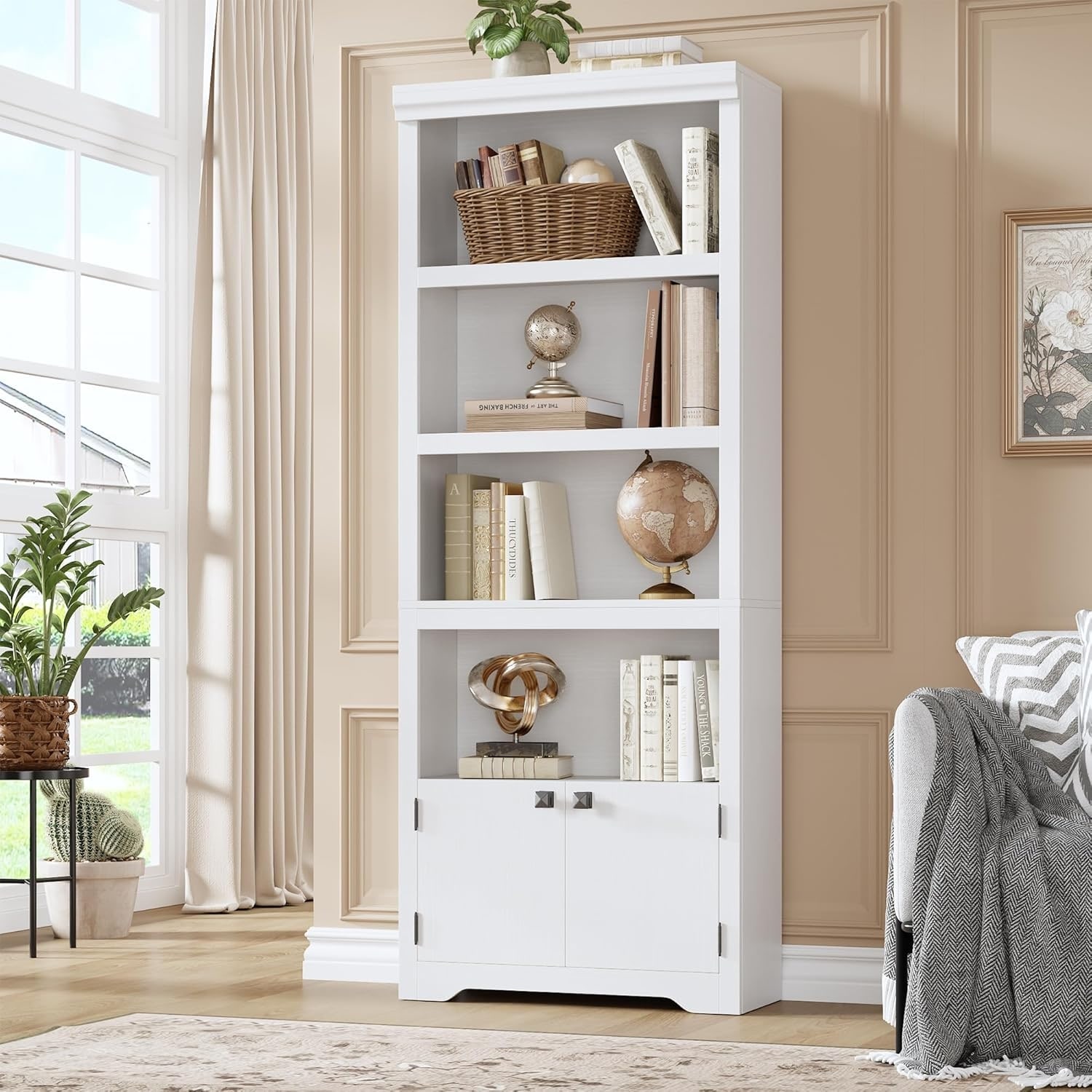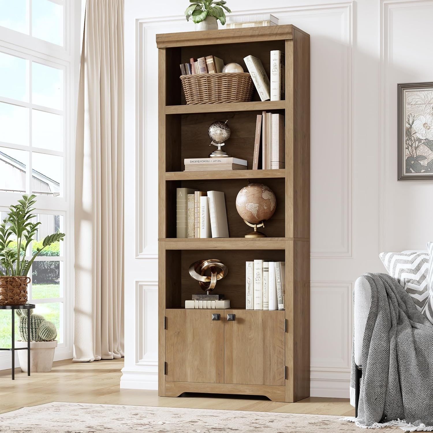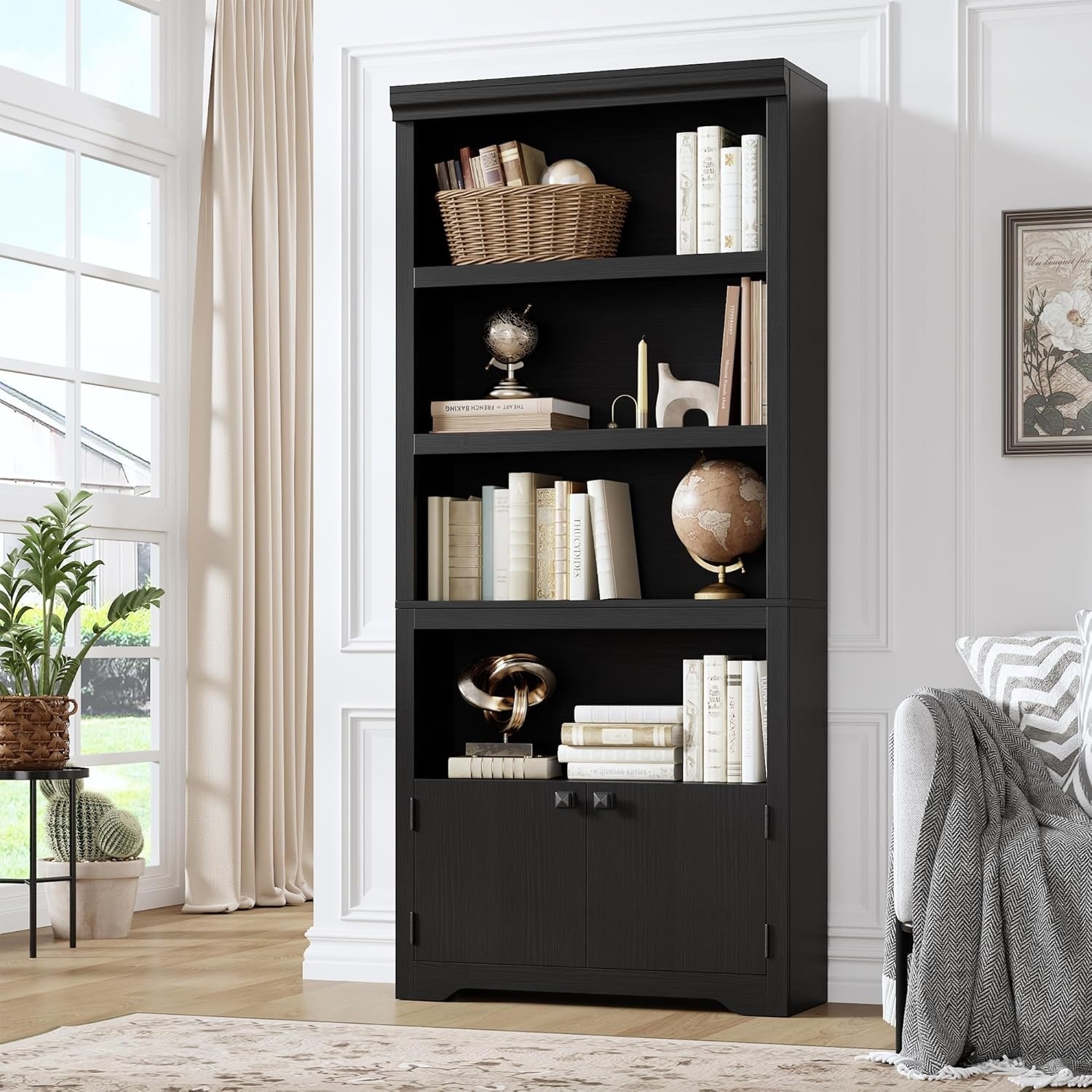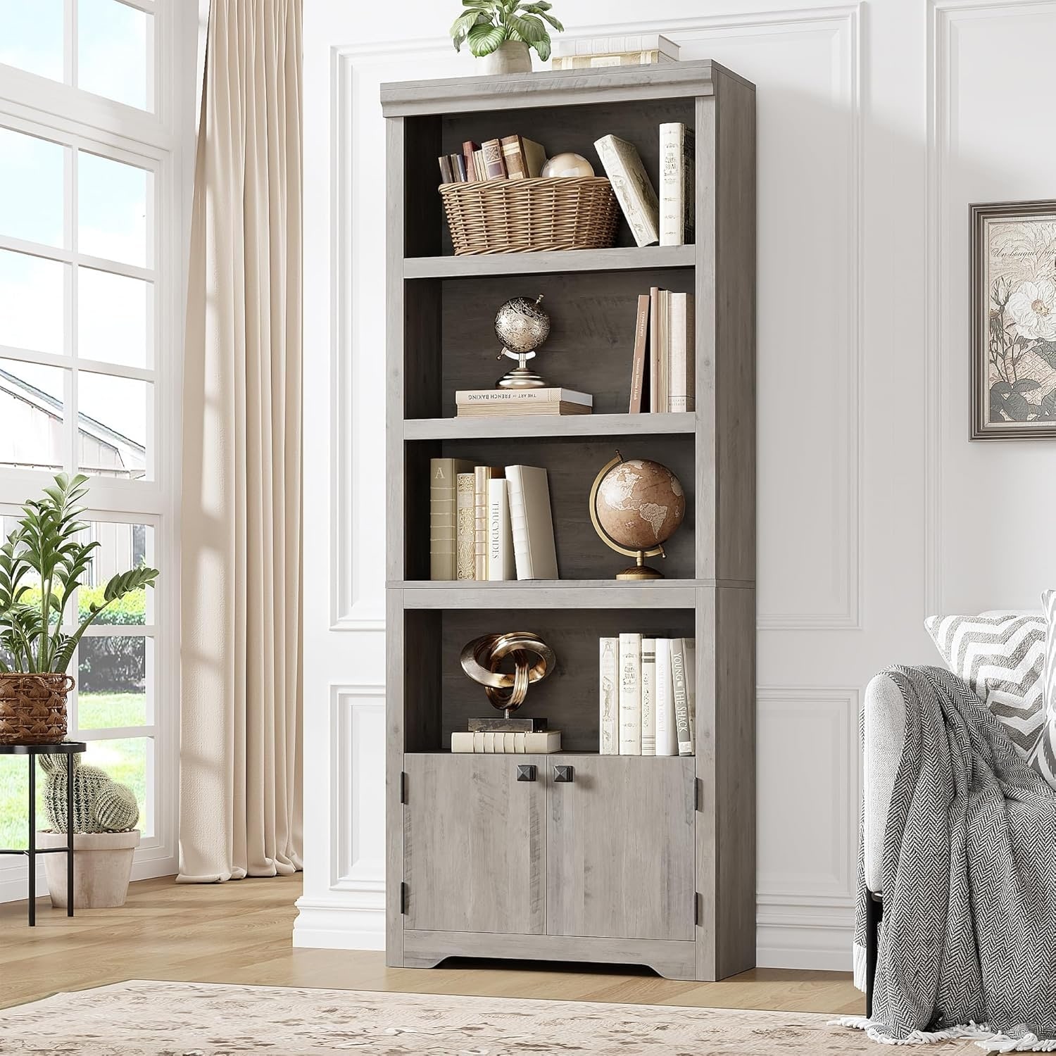 Farmhouse Bookcase with 2 Doors & Adjustable Shelves - Open Display Storage Rack with Anti-Slip Design