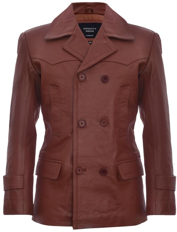 Cow Hide Dr Who Naval German Pea Coat Jacket - Brown - Infinity Leather Jackets