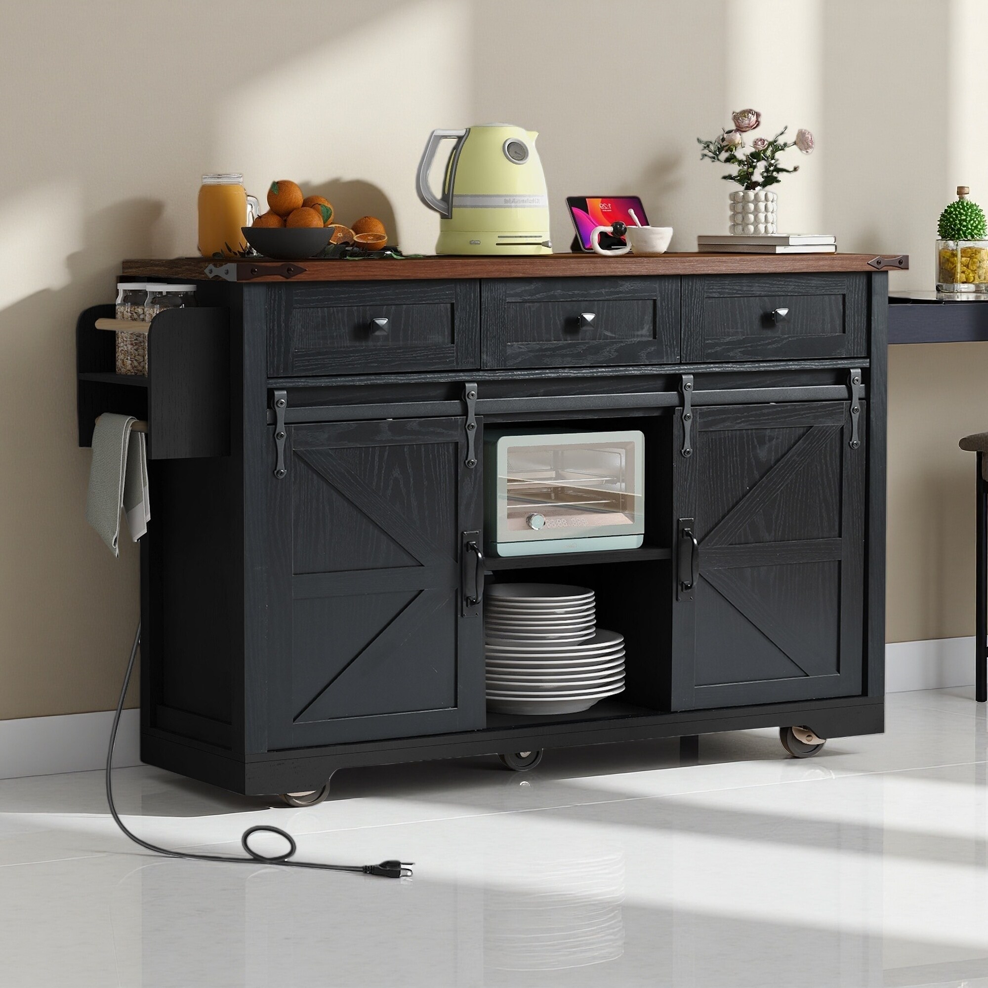 Kitchen Cart with Power Outlet, 2 Sliding Barn Door and Drop Leaf