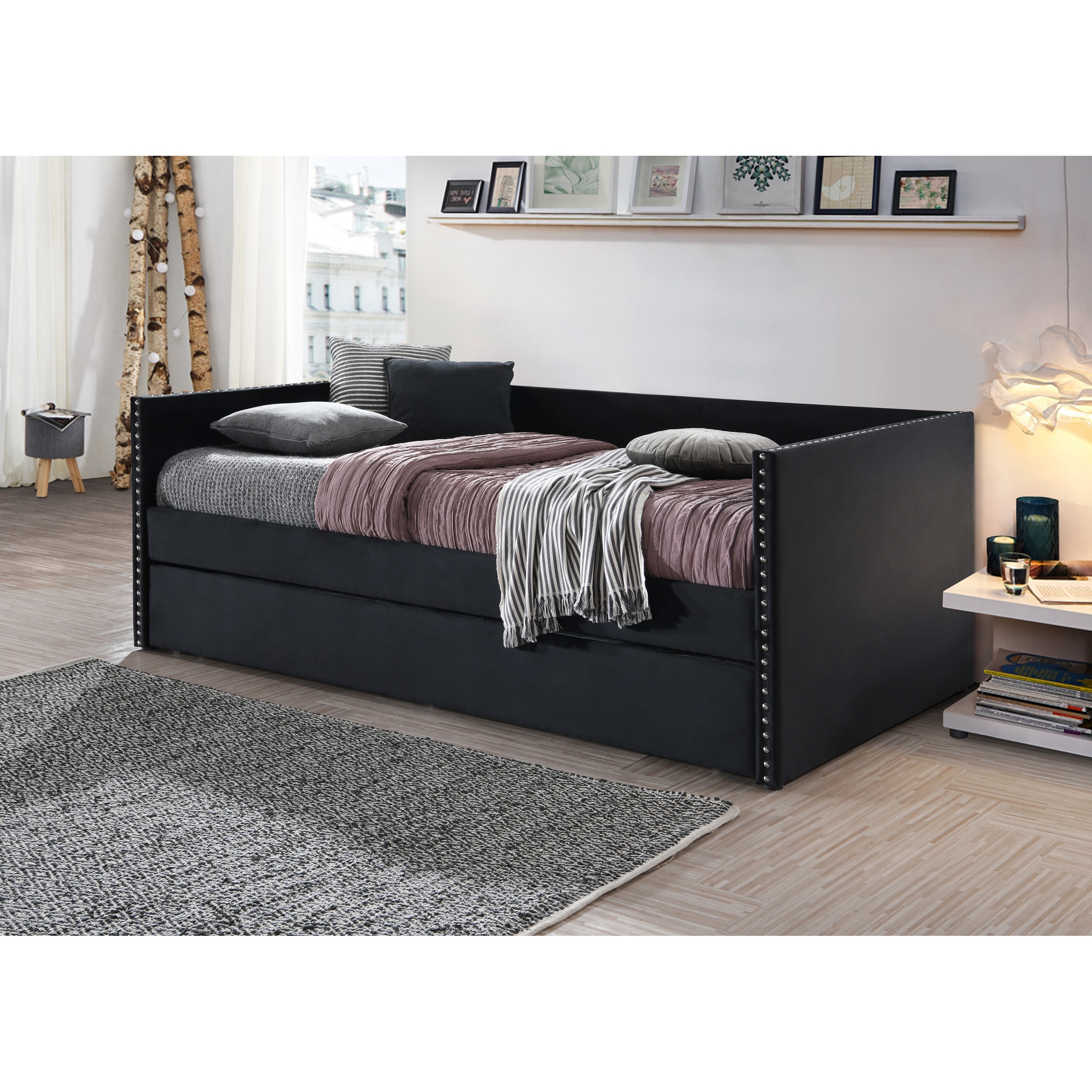 Beautiful 1Pc Modern Daybed Tufted Nailhead Trim Armrest Pull Out Trundle Bedroom Living Room Furniture Black Finish
