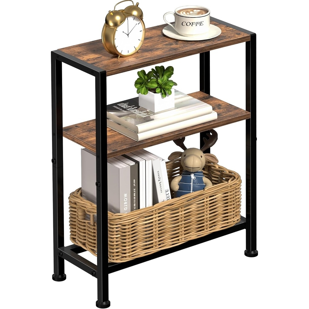 Compact 2-Tier Side Table with Shelf, Slim Nightstand for Small Spaces, Rustic Brown & Black