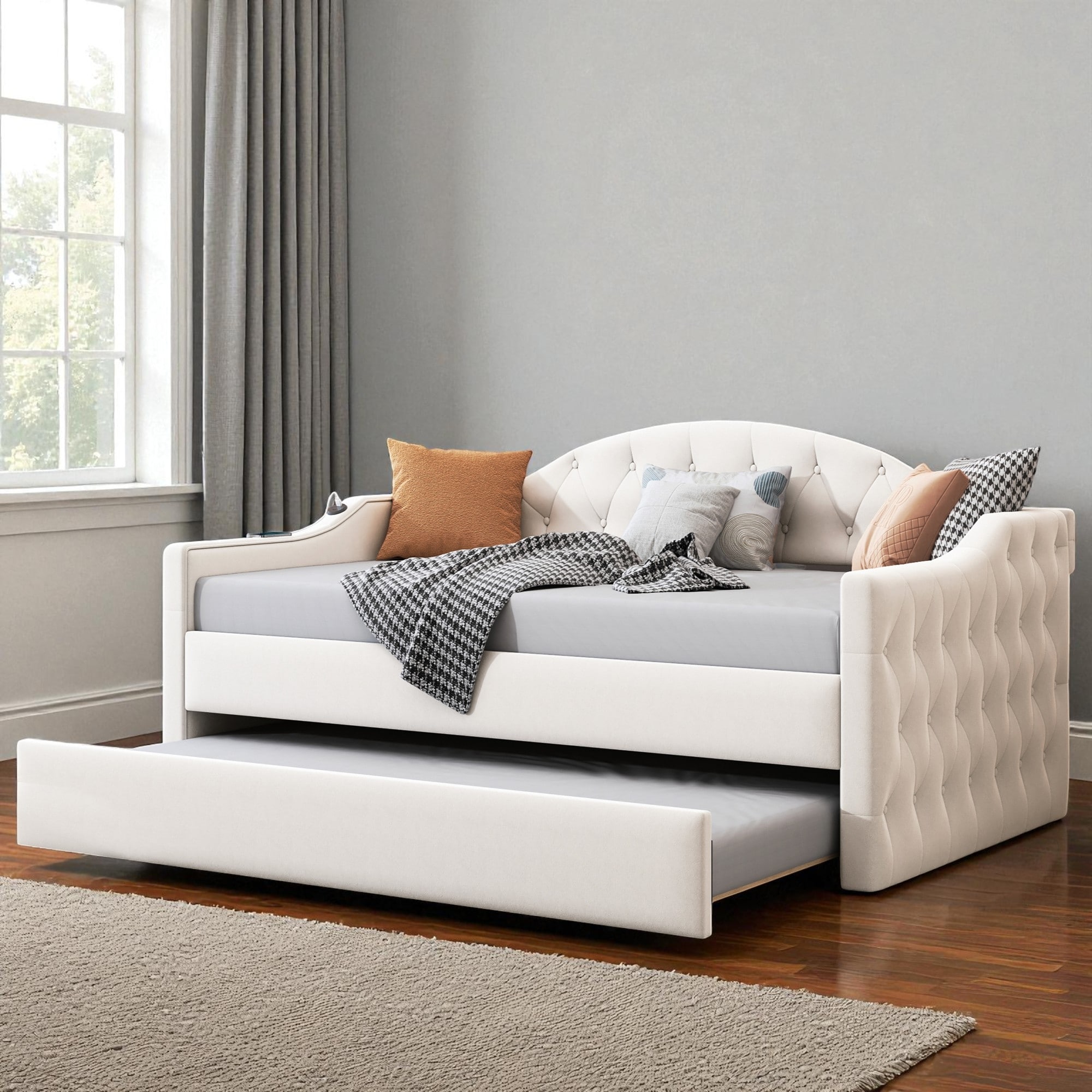 Twin Size Tufted Velvet Upholstered Daybed with Trundle, USB & Type-C Charging Ports, No Box Spring Needed