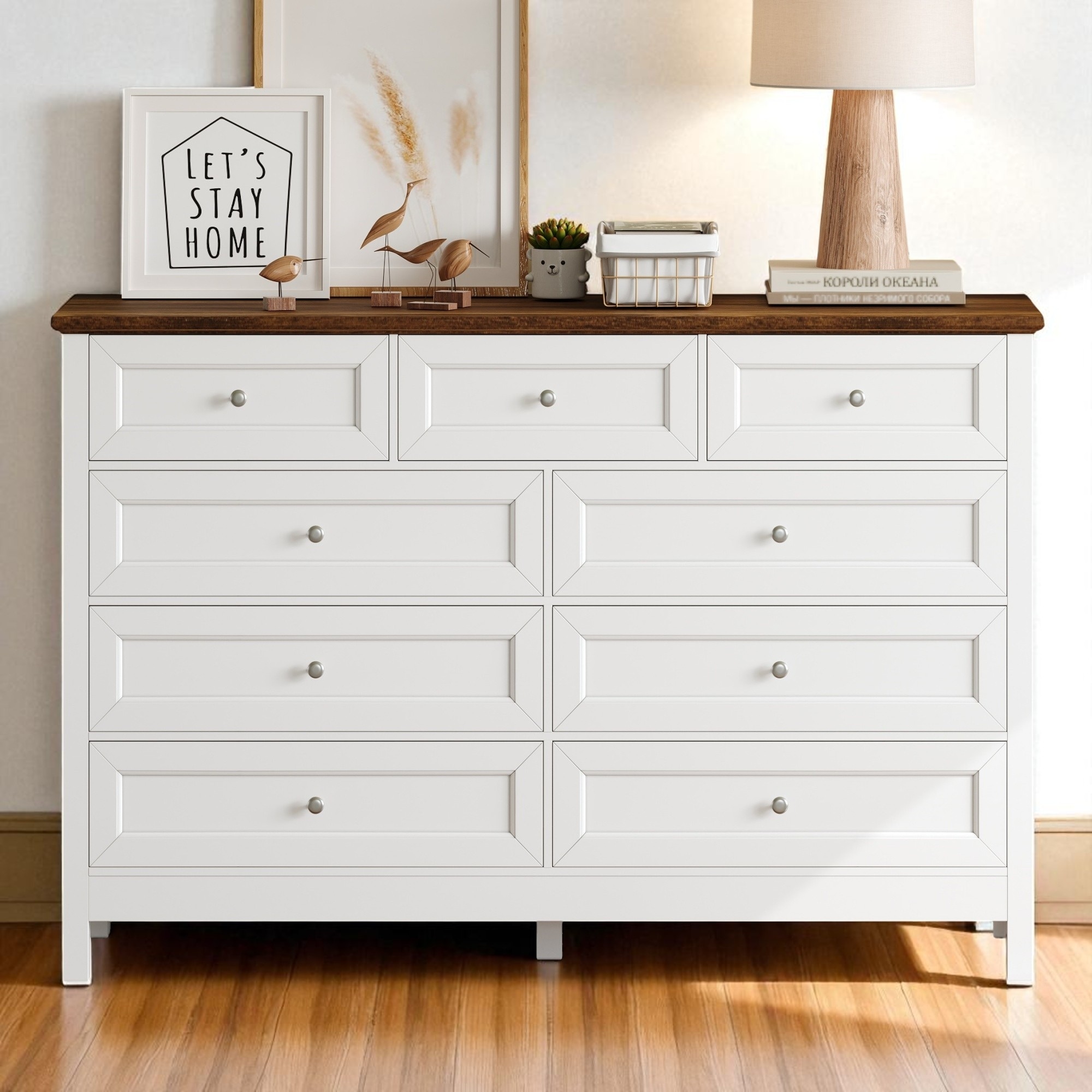 9-Drawer Wooden Dresser, Bedroom Storage Chest with X-Shaped Sides and Silver Handles, Solid Wood & MDF Construction.