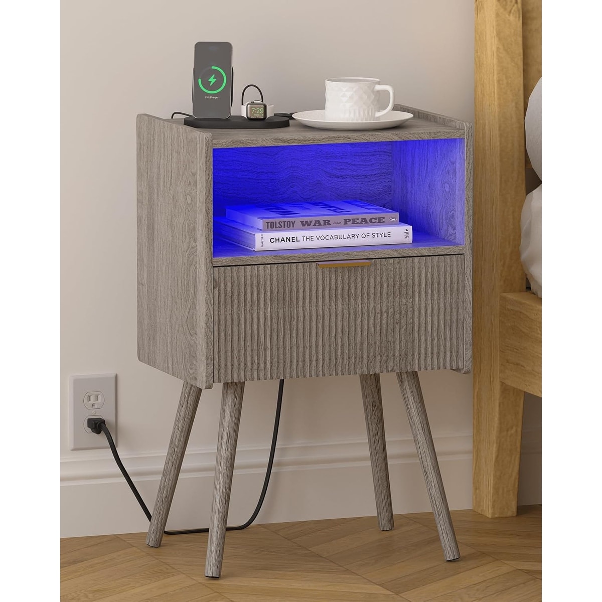 Modern Grey Oak Nightstand with Charging Station, LED Lights, Drawer & Shelf, Ideal for Bedroom & Small Spaces