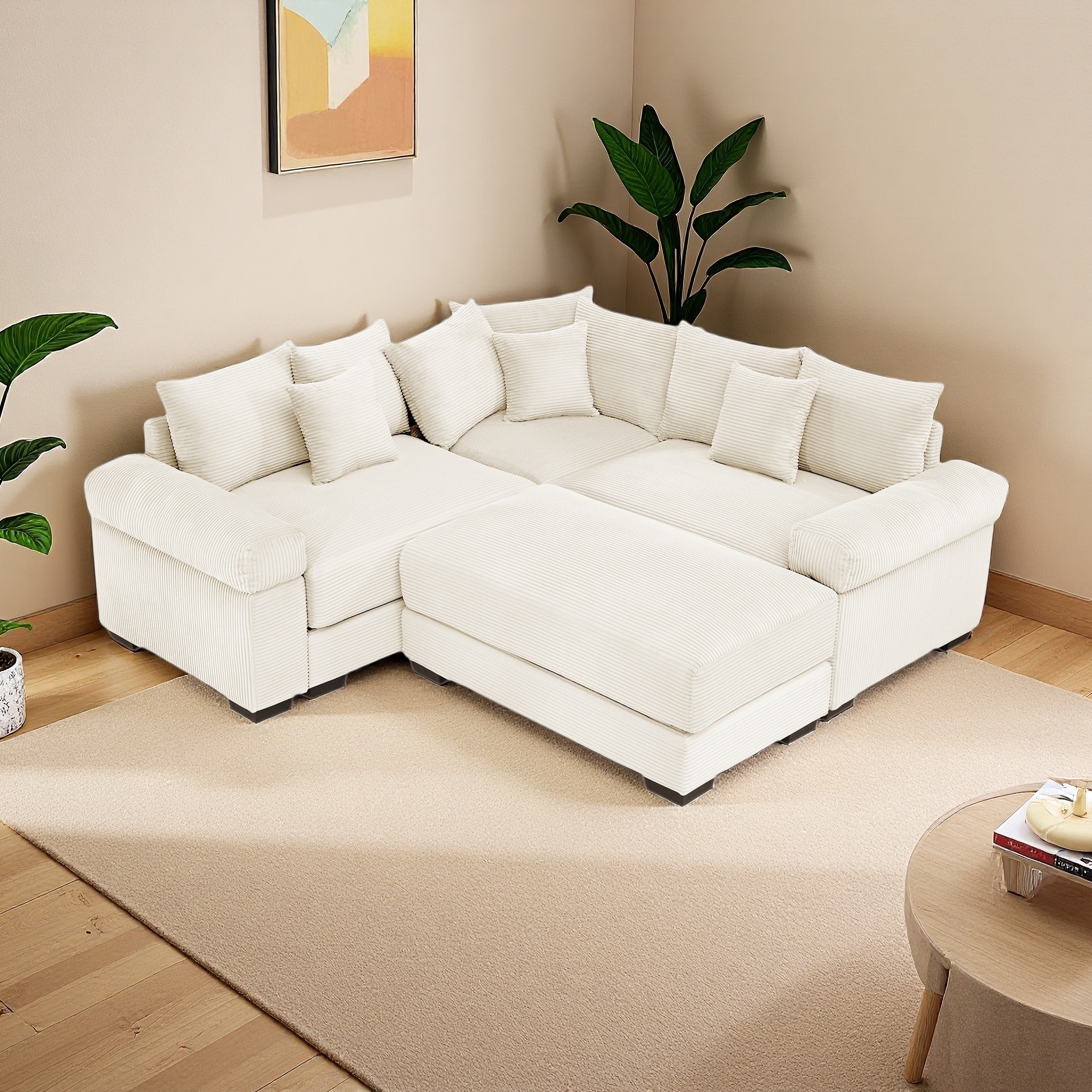 110.75" Oversized Corduroy Modular Sectional Sofa, L Shaped 4 Seat Couch with Movable Footstool, Cup Holders & 8 Throw Pillows