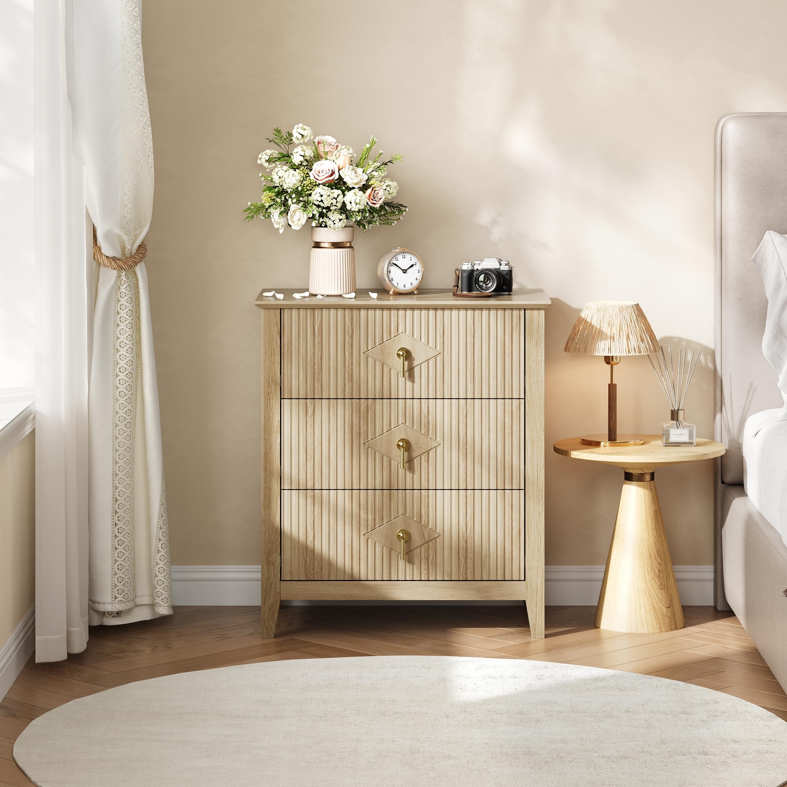 Fluted 3 Drawer Dresser for Bedroom, 31.5 Inch Tall Modern Nightstand Wooden Chest of Drawers with Gold Handles