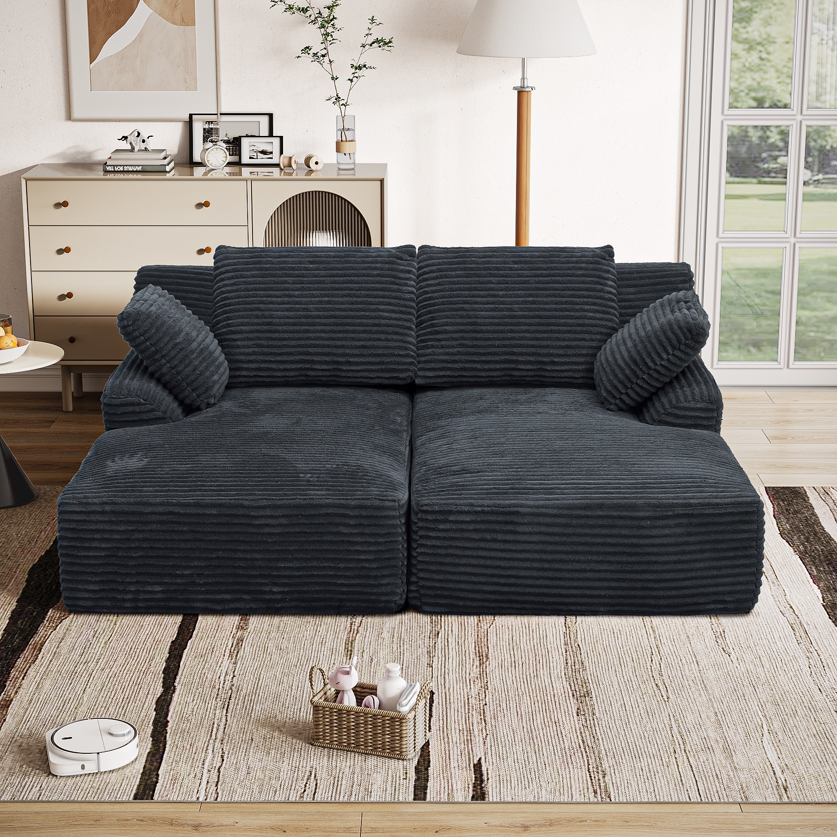 118.2" Oversized Modular Foldable Floor Sofa Couch, Corduroy Upholstered Convertible Sectional Sofa Bed w/ Pillows for Apartment