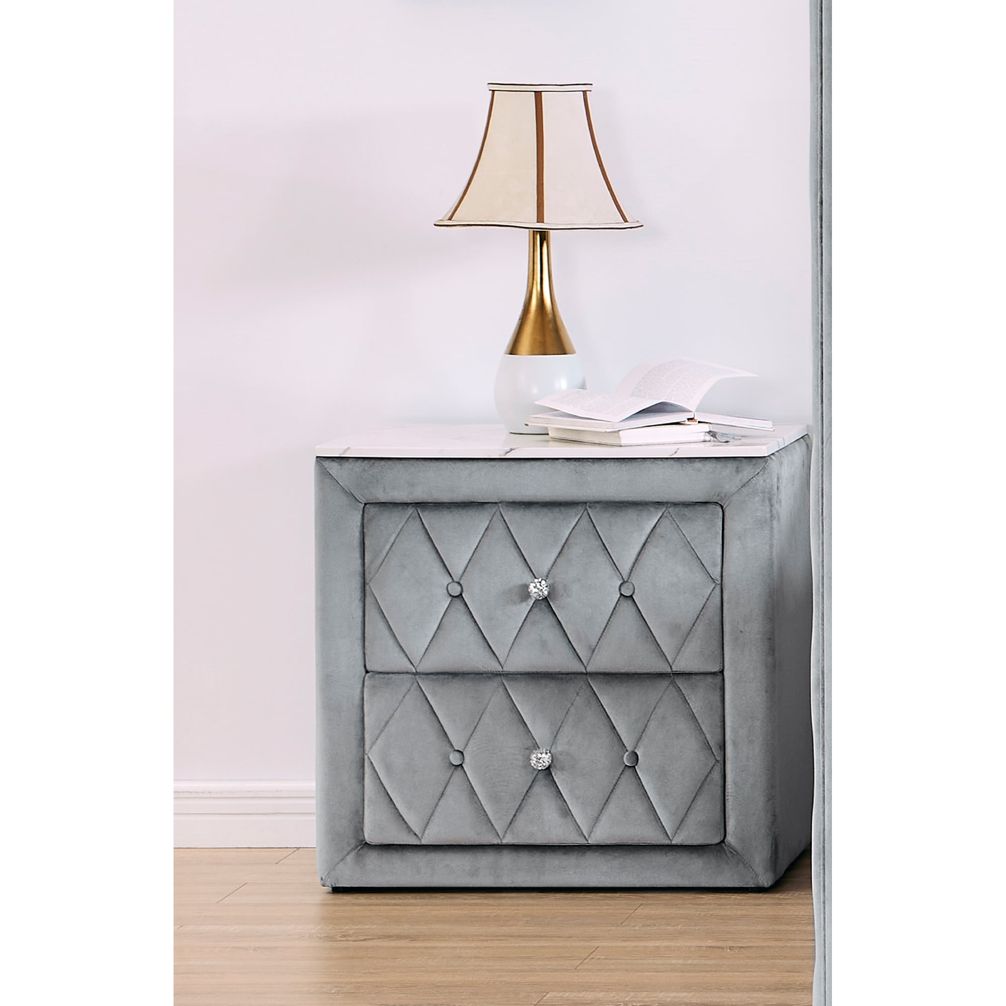 1pc faux marble top nightstand 2- drawers storage gray finish button tufted faux crystal tufted