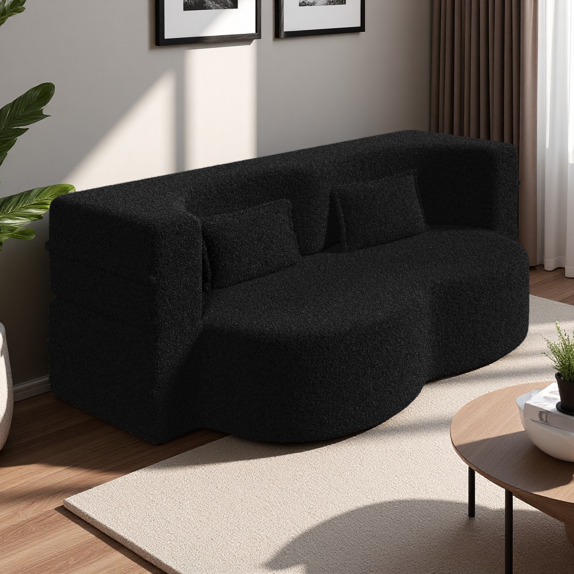 78" Full Size Floor Sofa with 2 Pillows, Convertible Teddy Fabric Foam-Filled Sleeper Sofa Bed, Folding Mattress for Living Room
