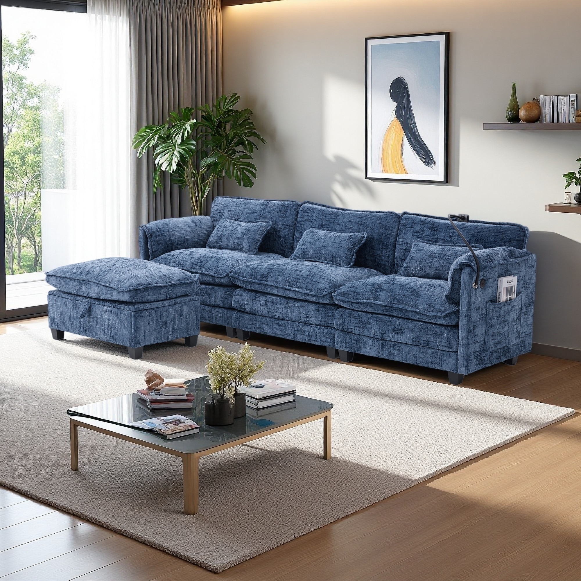 Chenille Modular Corner Sofa and Ottoman Set with Wood Frame (Set of 3)
