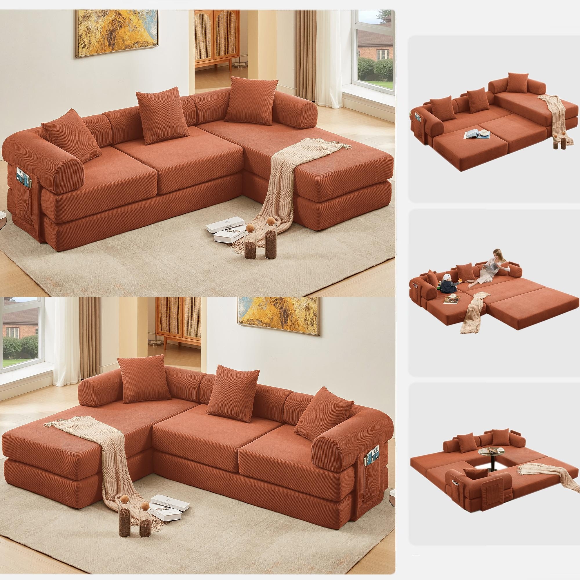 Versatile 7-in-1 Modular Folding Sectional Sofa with Chaise Convertible Corduroy Sleeper Sofa Bed with Removable Storage Bags
