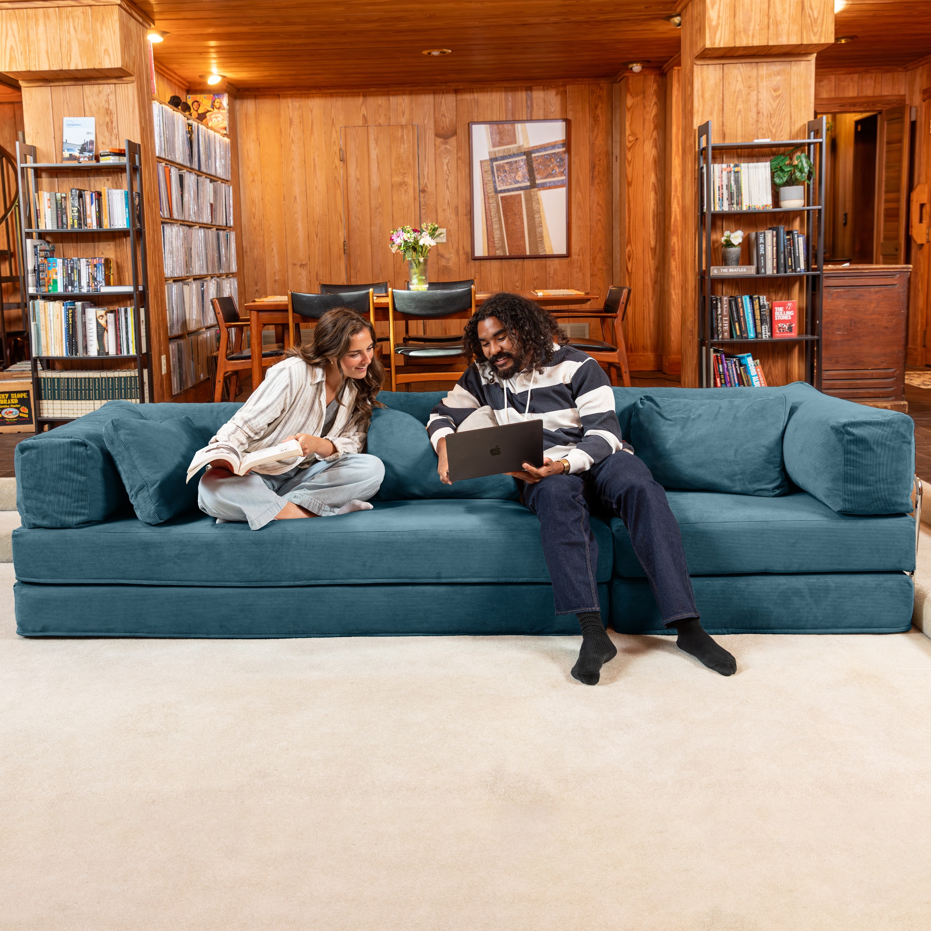 Modern Corduroy L-shaped Sectional Sofa with Chaise Expanded into Queen Size Floor Bed Comfy Compressed Sofa Couch