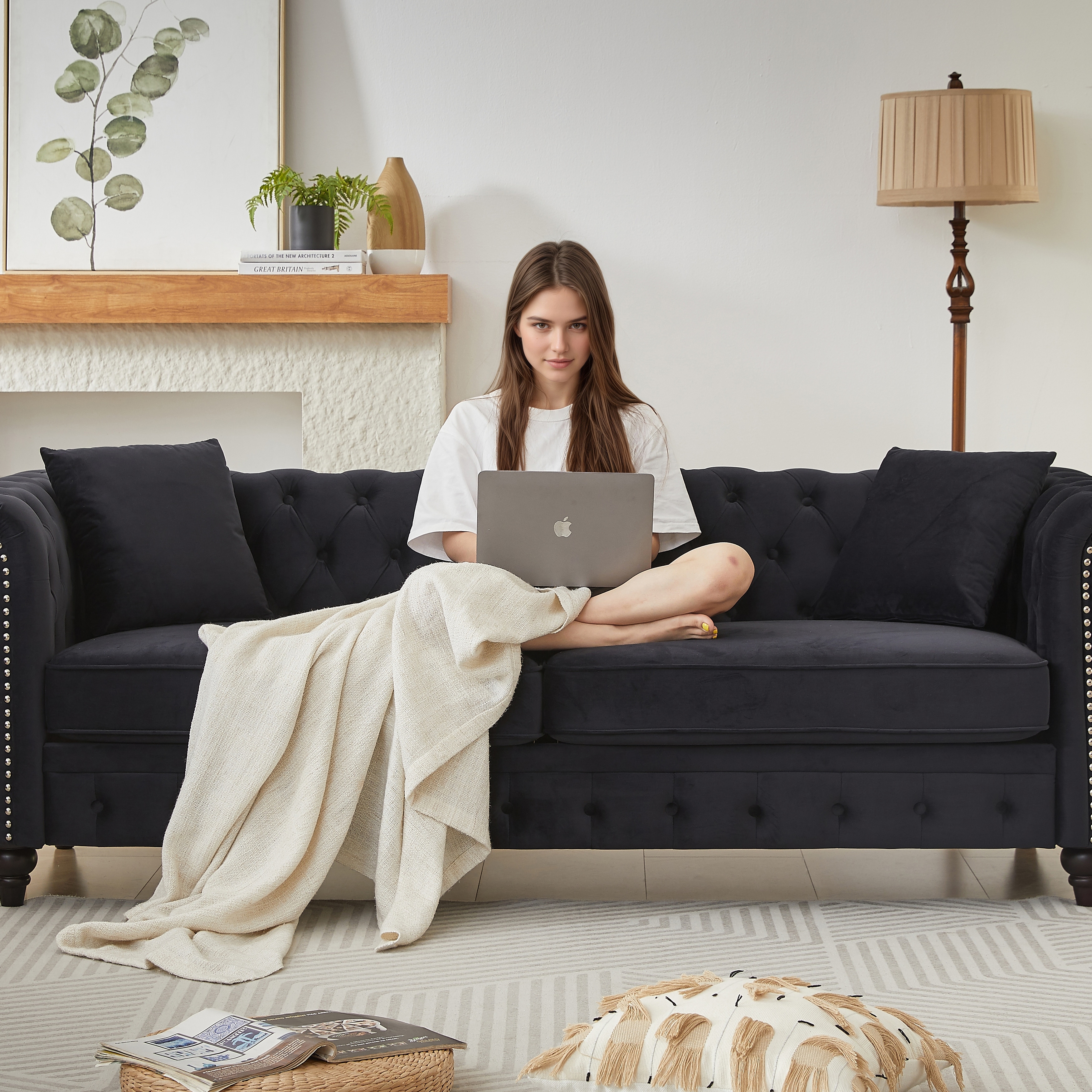 Velvet Chesterfield 3 Seater Sofa, Oversized Button Tufted Upholstered Sofa, Deep Seat Sofa with Rolled Arms & Nailhead Trim