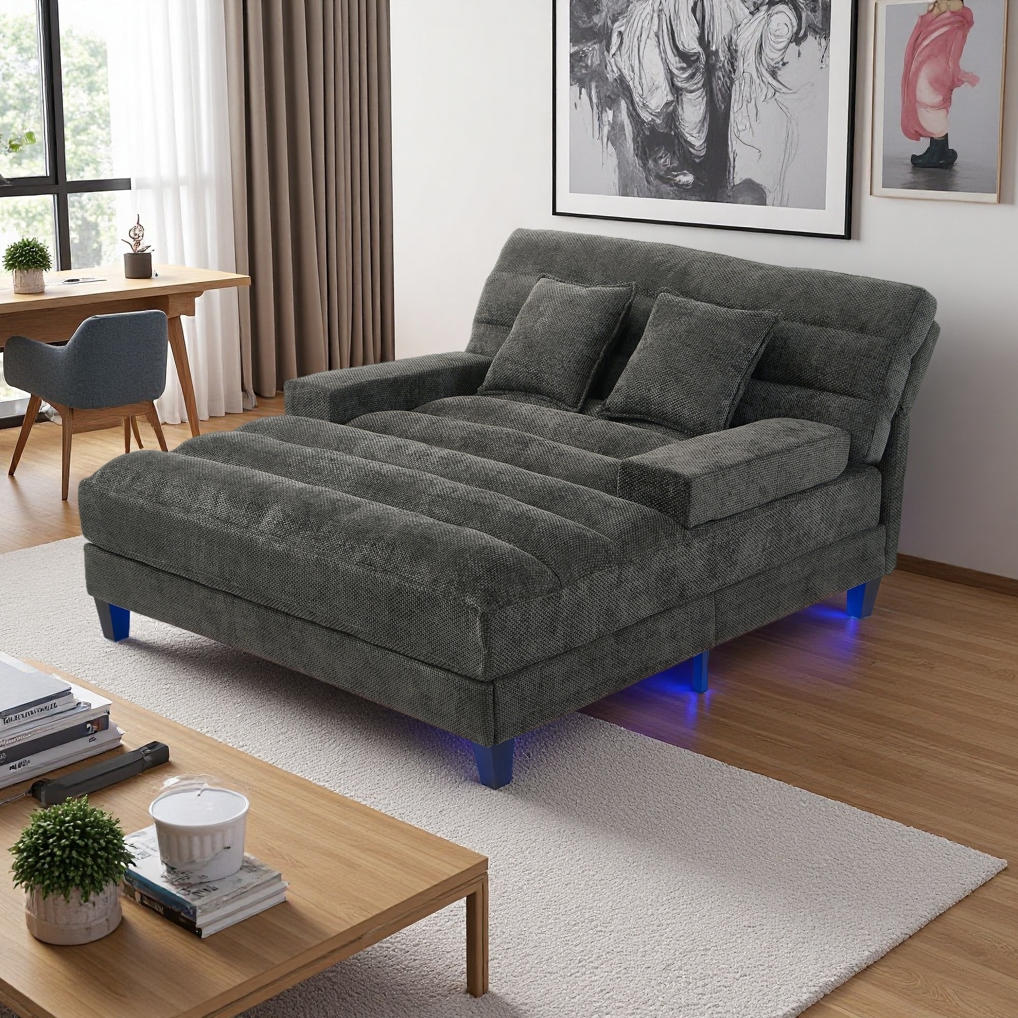 57.1" Chenille Upholstered Chaise Lounge Sofa Bed with Adjustable Backrest, RGB LED Lighting & Smart Control for Living Room