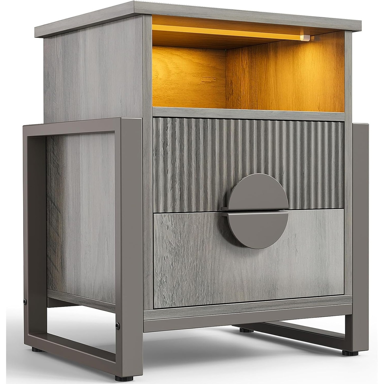 Fluted Nightstand with Charger Station, LED Strip Lights, 2 Drawers, Open Cubby Storage, Gray