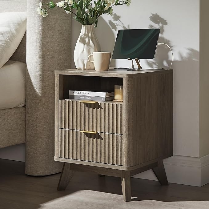 Fluted Nightstand, Wood Night Stand Mid Century Modern with Drawer and Storage