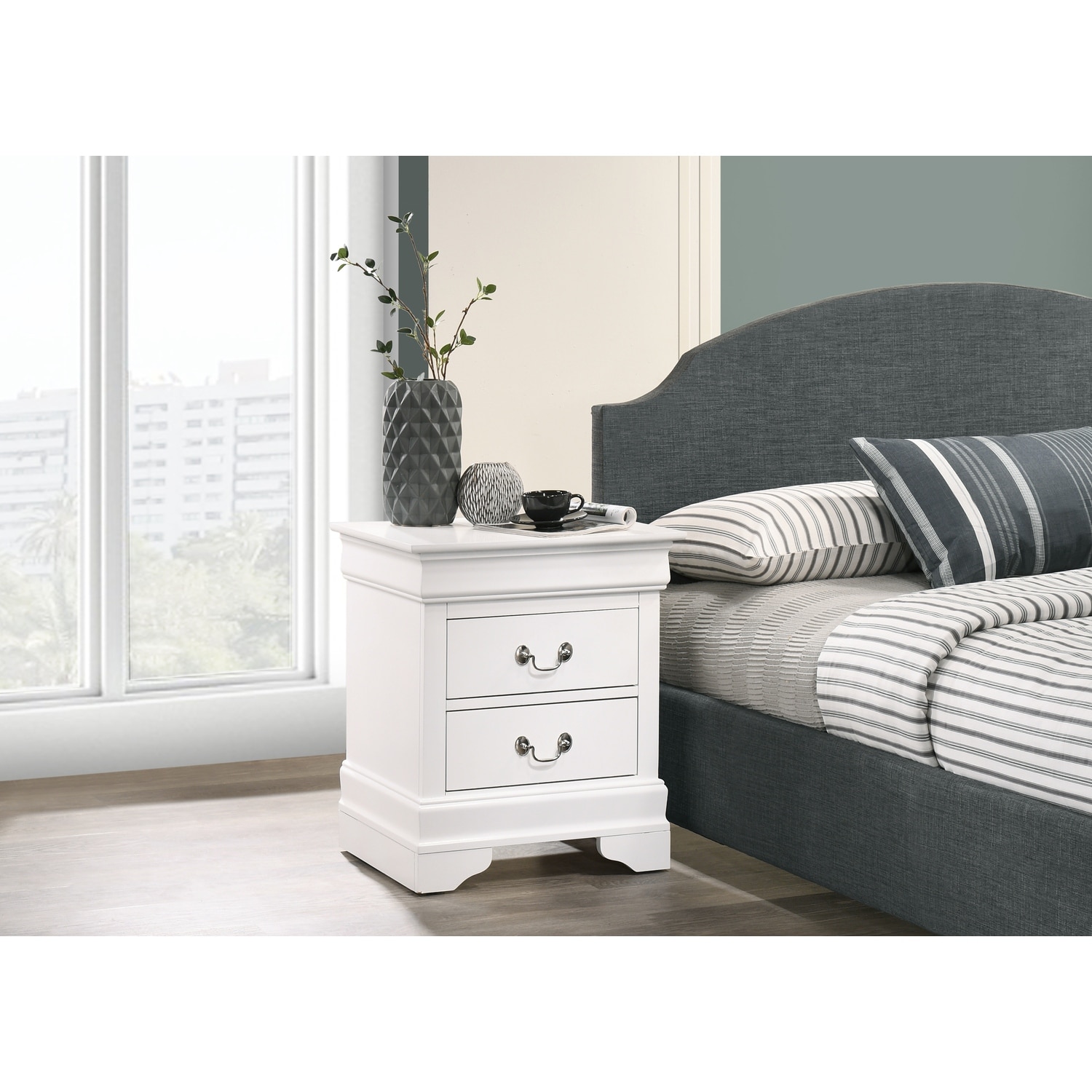 Charming White Finish 2-Drawer Nightstand Durable Wood Black Handles Classic Bedside Table 1pc Bedroom Furniture