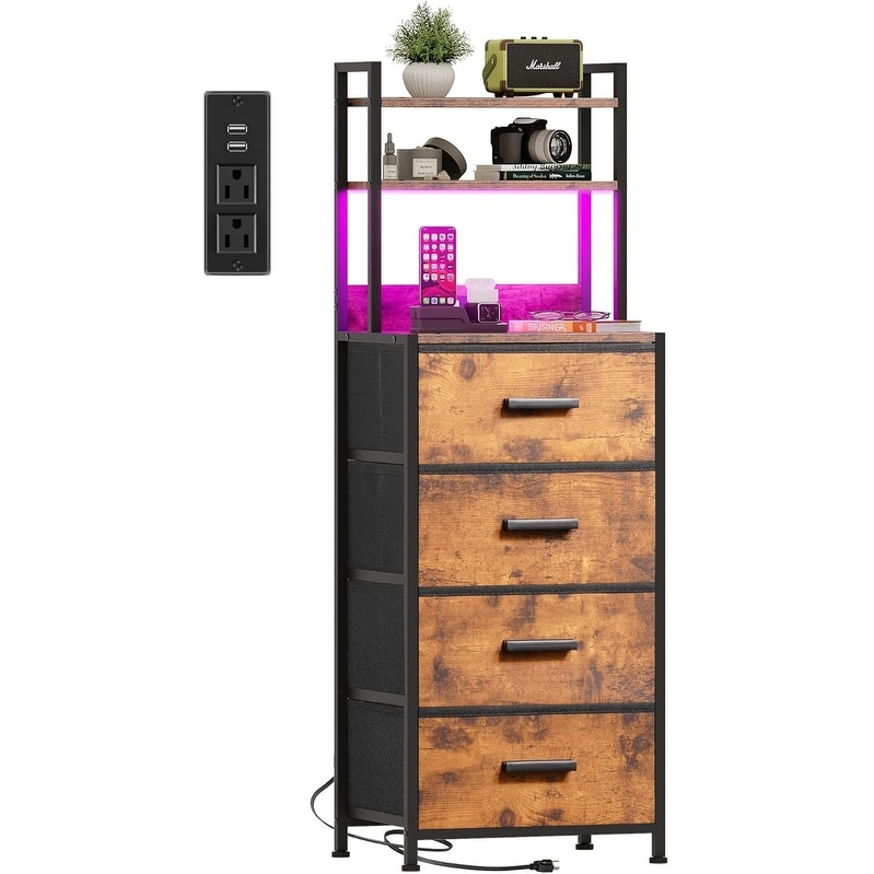 4-Drawer LED Nightstand with Charging Station, Fabric Drawers, and 3 Open Shelves, Rustic Brown