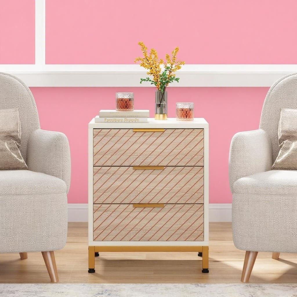 White and Gold Nightstand with 3-Drawer, Acrylic Legs, Elegant Design