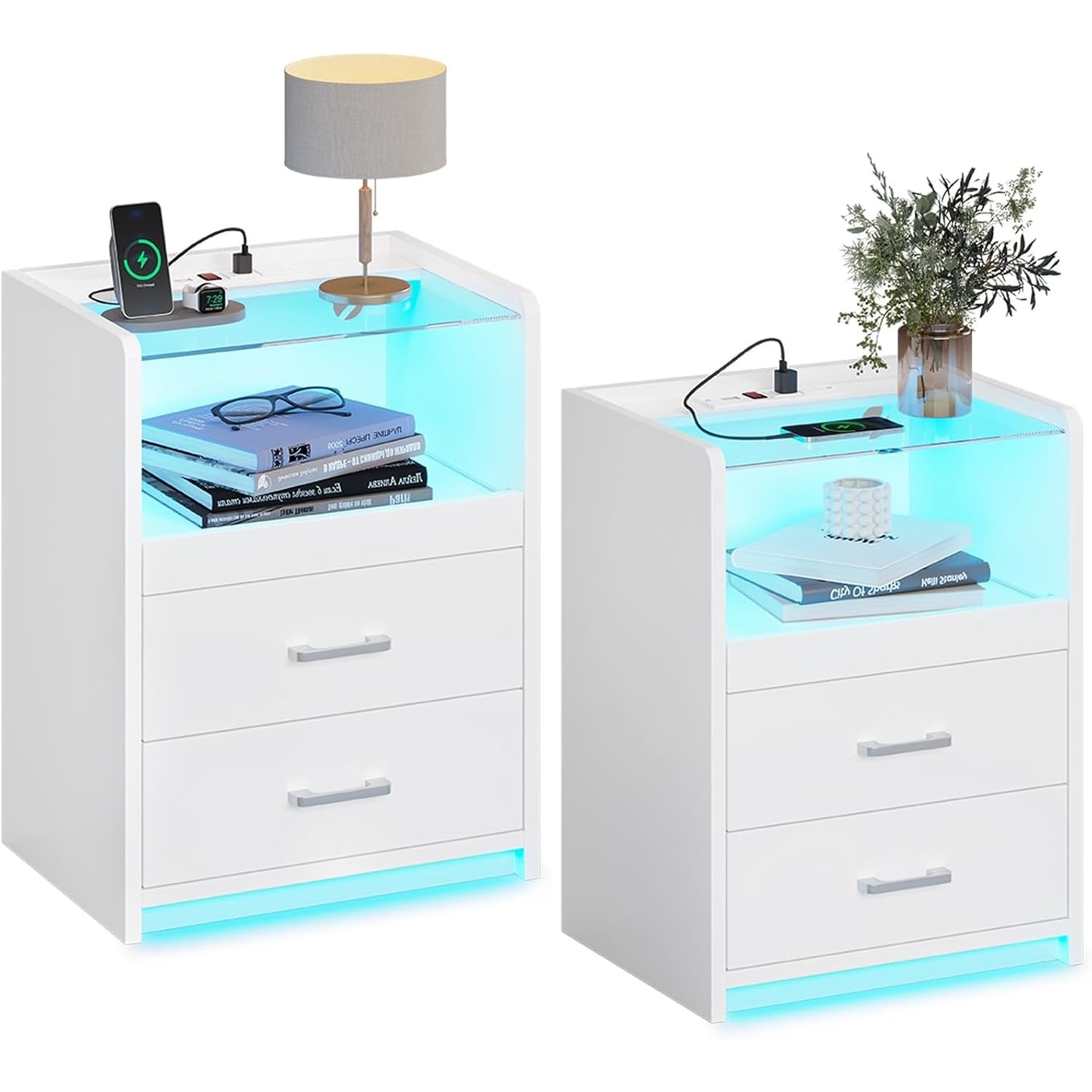 Modern LED Nightstand Set of 2 with Charging Station, Pull-Out Shelf, 2 Drawers, USB Ports, Outlets, White