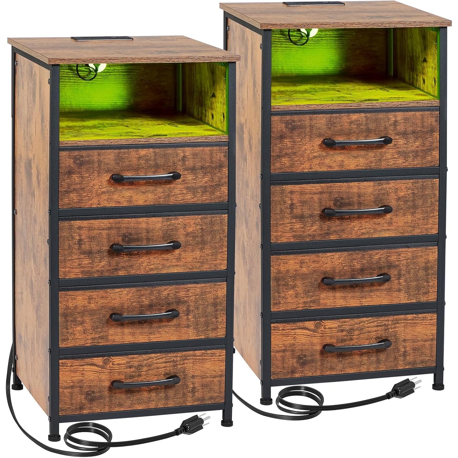 Tall Nightstand with Charging Station, 4 Drawers, USB Ports, Outlets, LED RGB Lights, Rustic Brown