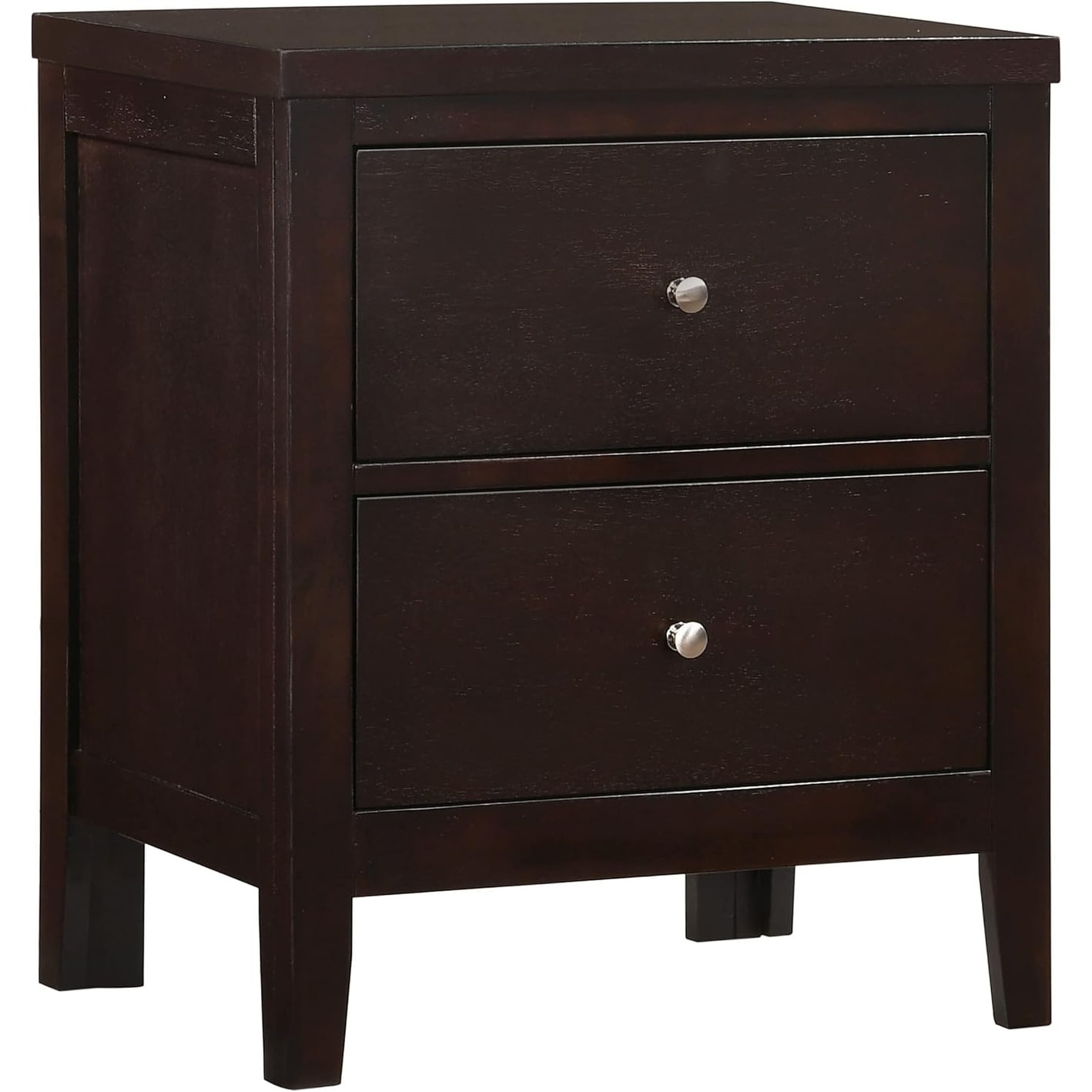 2-Drawer Wood Nightstand with Flat Drawer Fronts, Round Knobs, and Tapered Legs in Cappuccino Finish