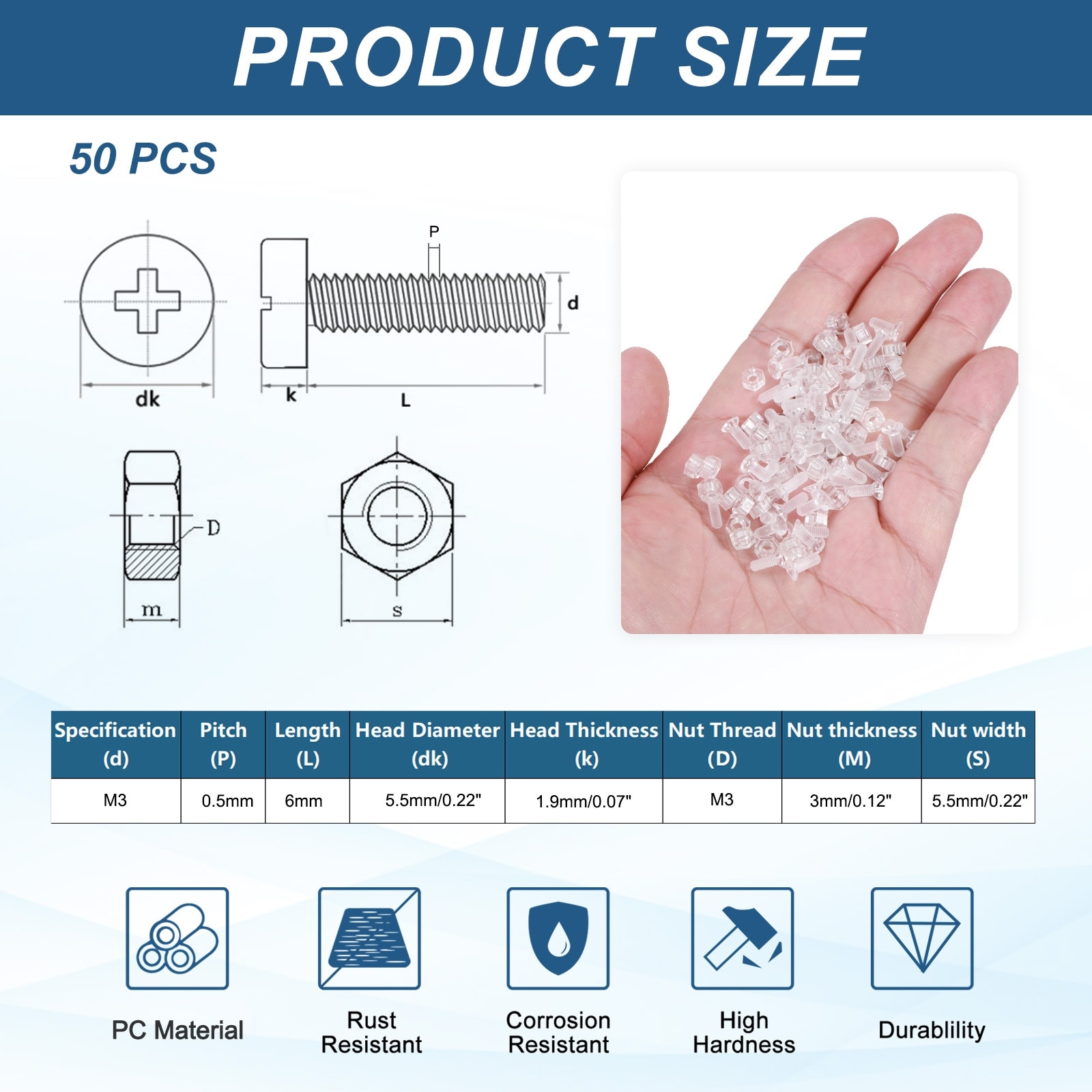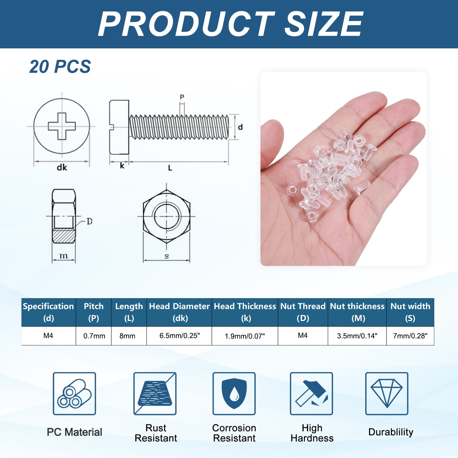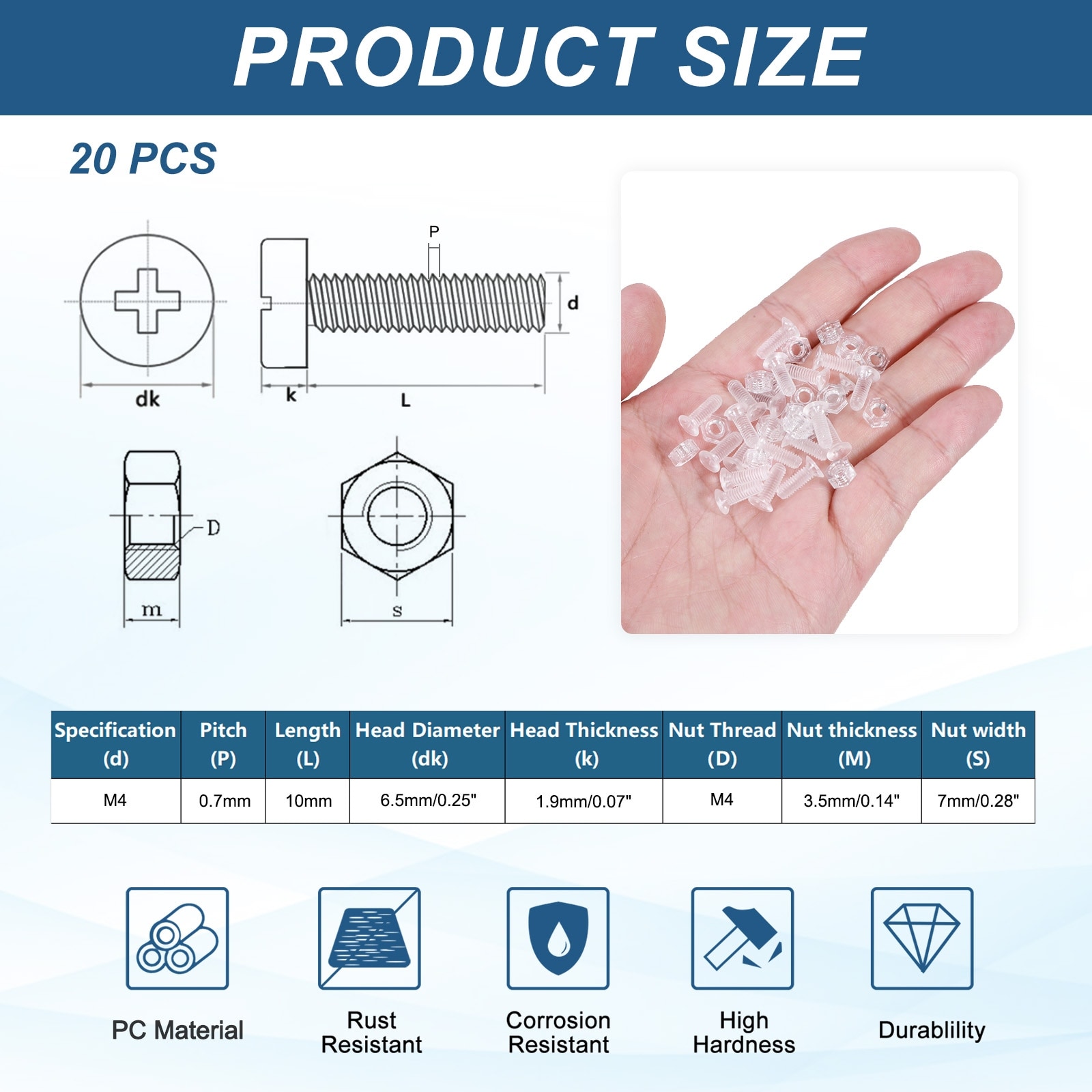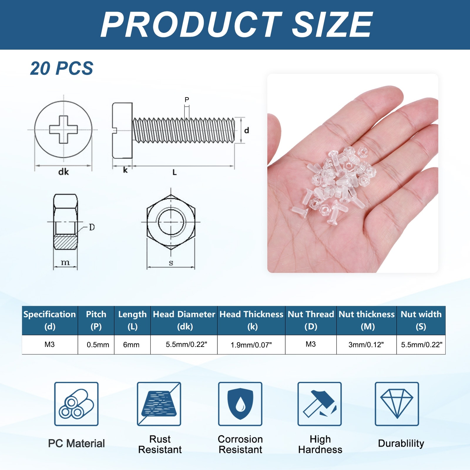 PC Clear Cross-recessed Countersunk Screws and Hex Nuts Kit, Plastic Machine Screws Round Head Acrylic Bolts