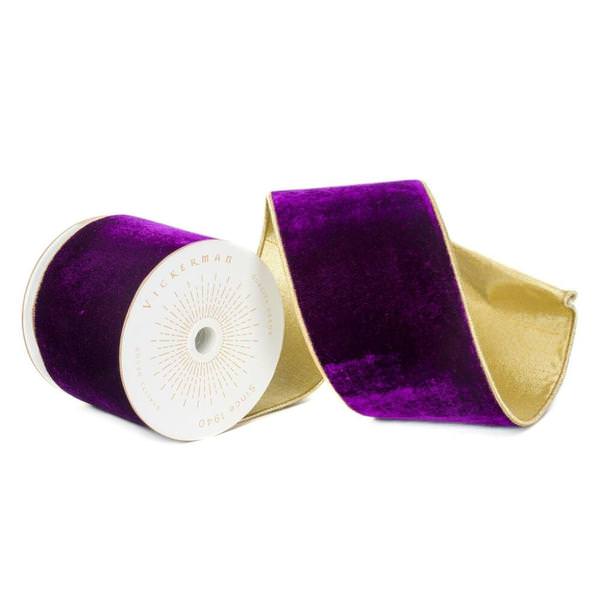 Vickerman 776094 - 4"x10yd Purple Velvet Gold Trim/Back (QK242580) Purple Colored Christmas Ribbons