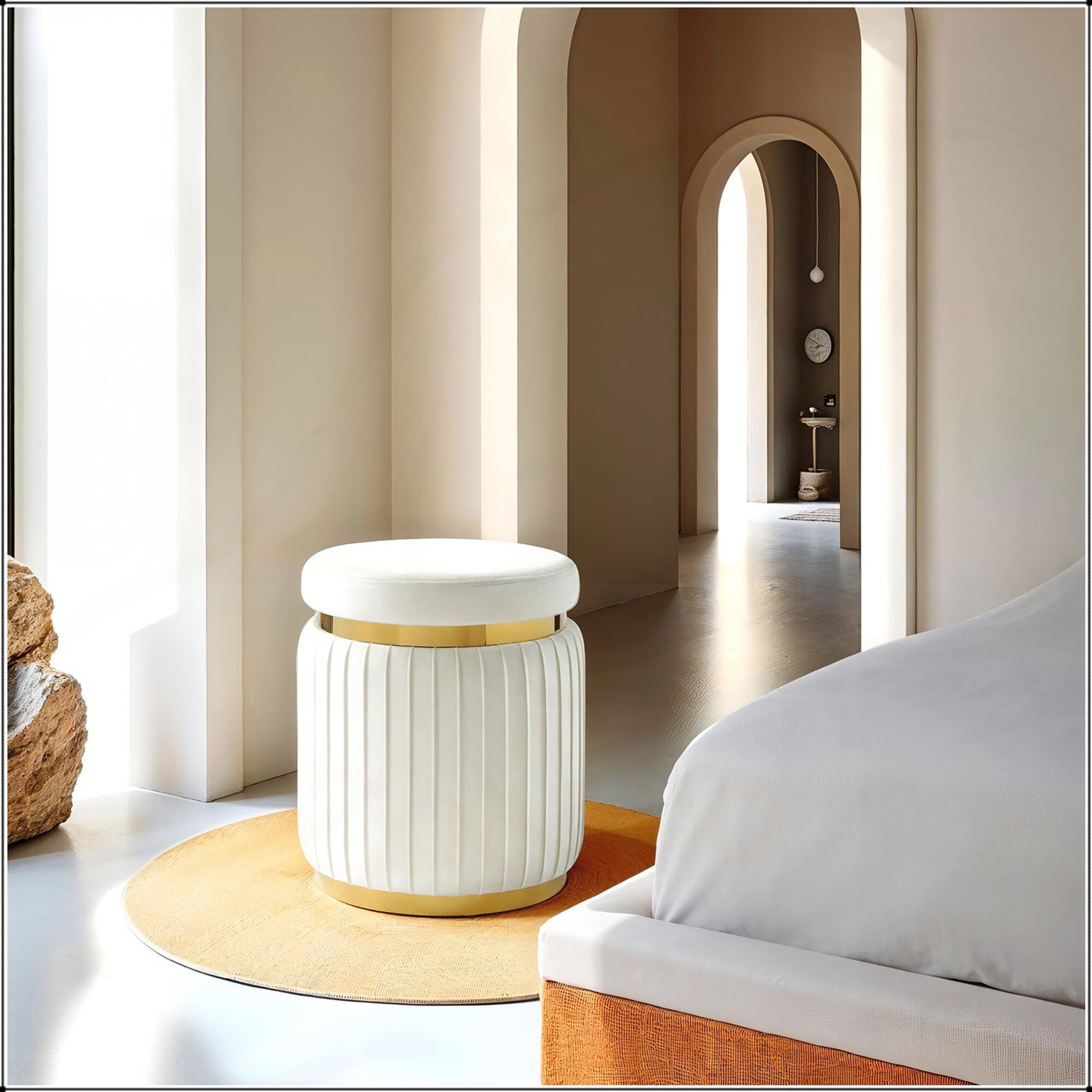 Round Accent Stool Stainless Steel Gold Trim Velvet Fabric White Finish