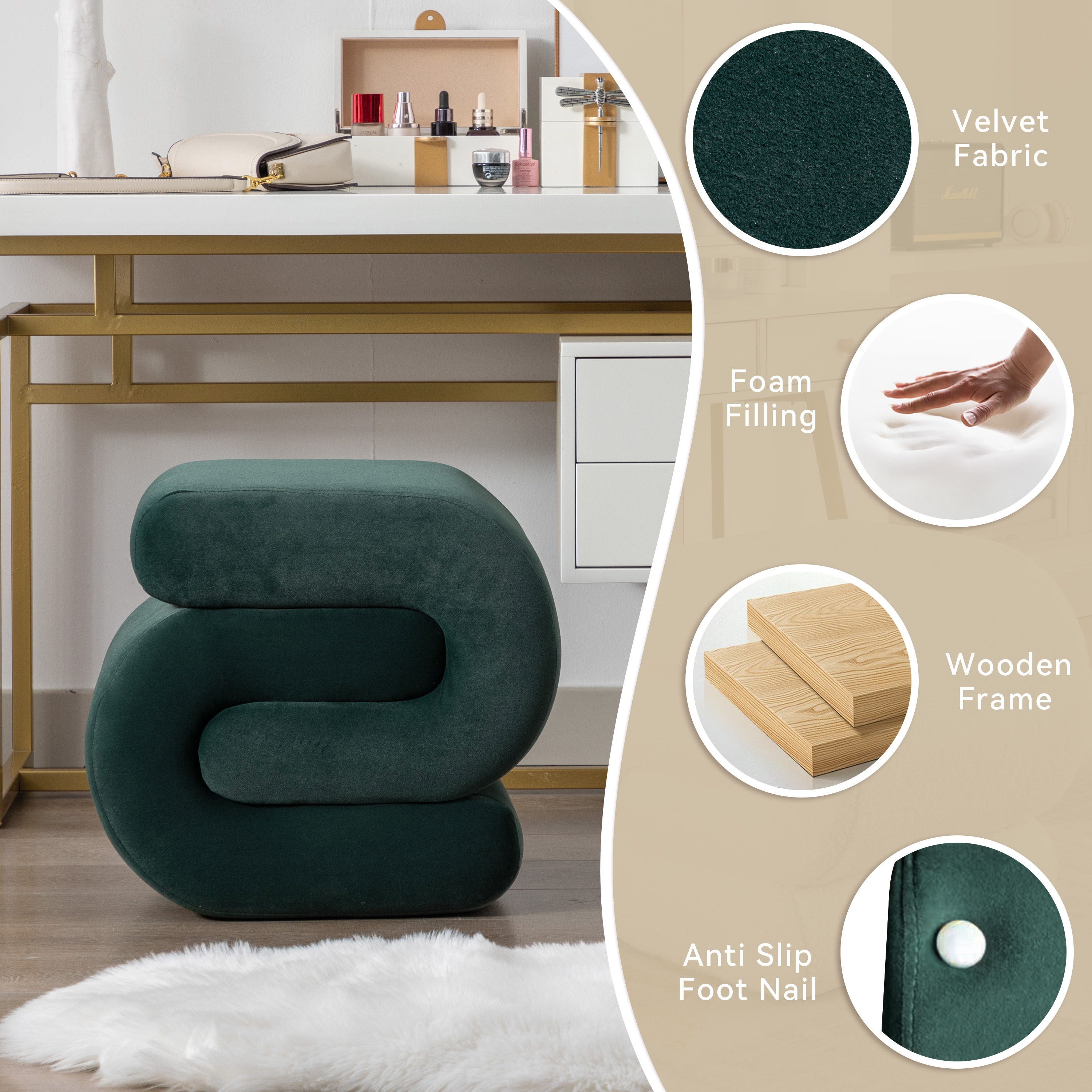 Modern Velvet Upholstered Ottoman, Exquisite Small End Table, Soft Foot Stool,Dressing Makeup Chair